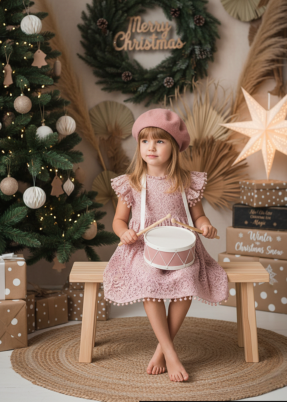 Sunflower Lace Pom Pom Trim Girl Dress in Dusty Pink