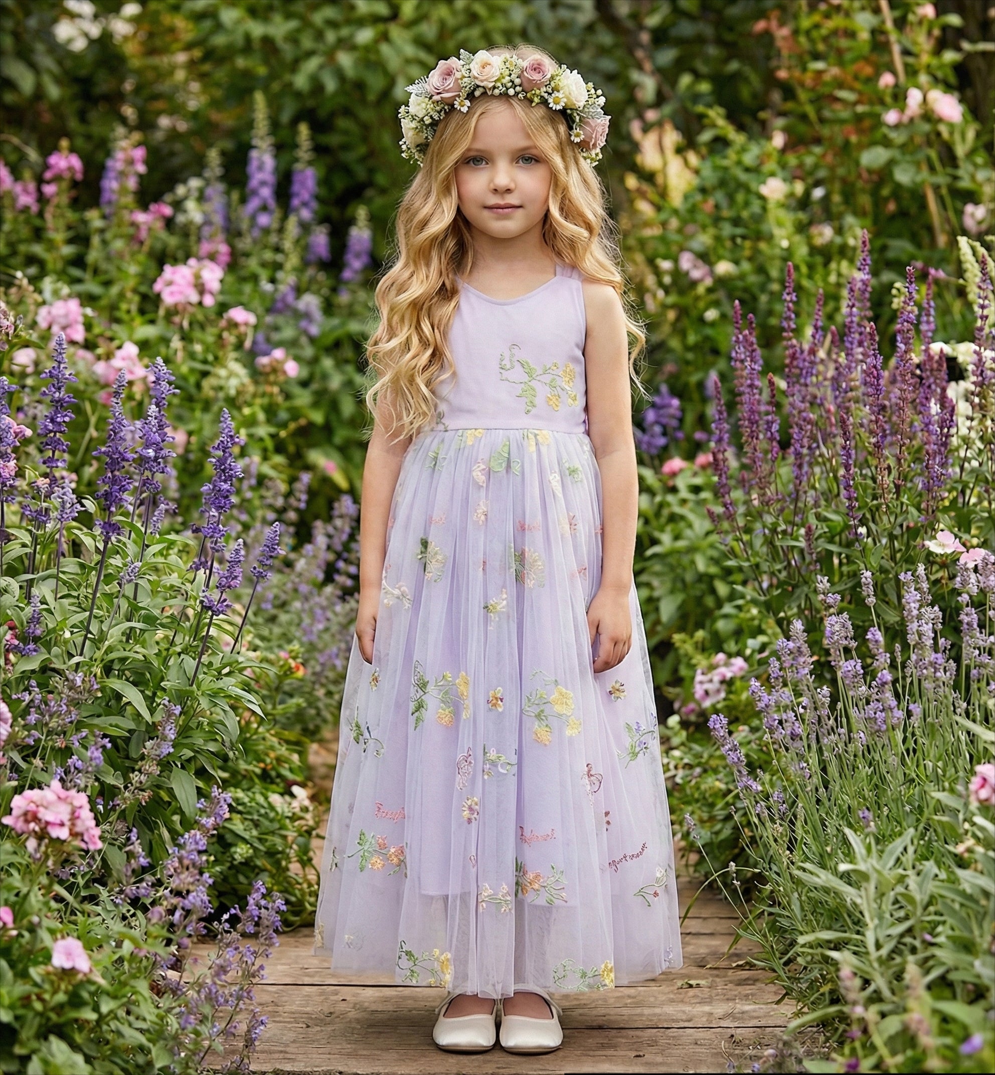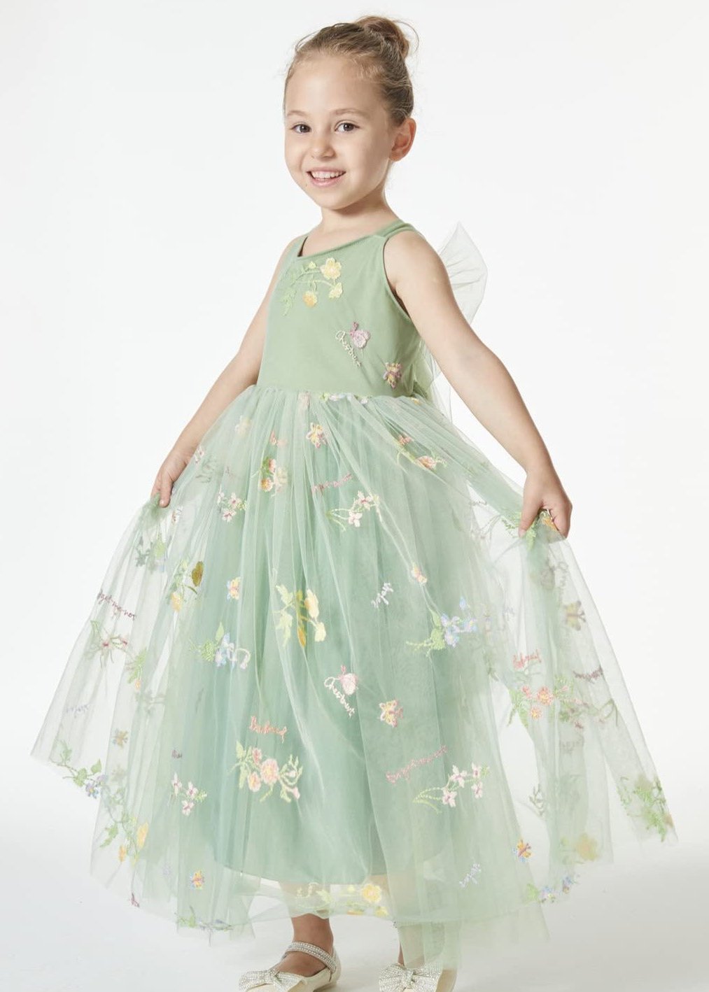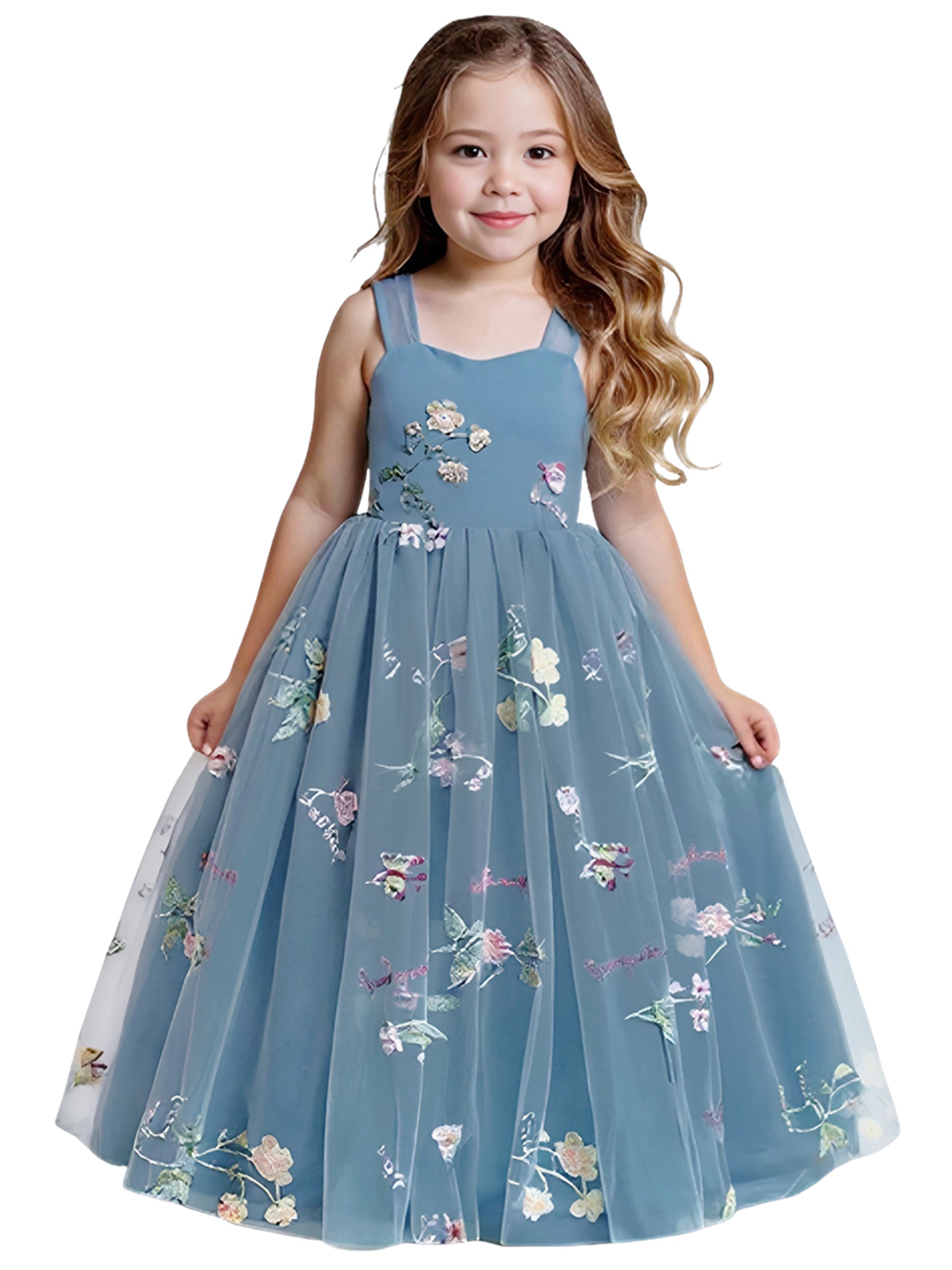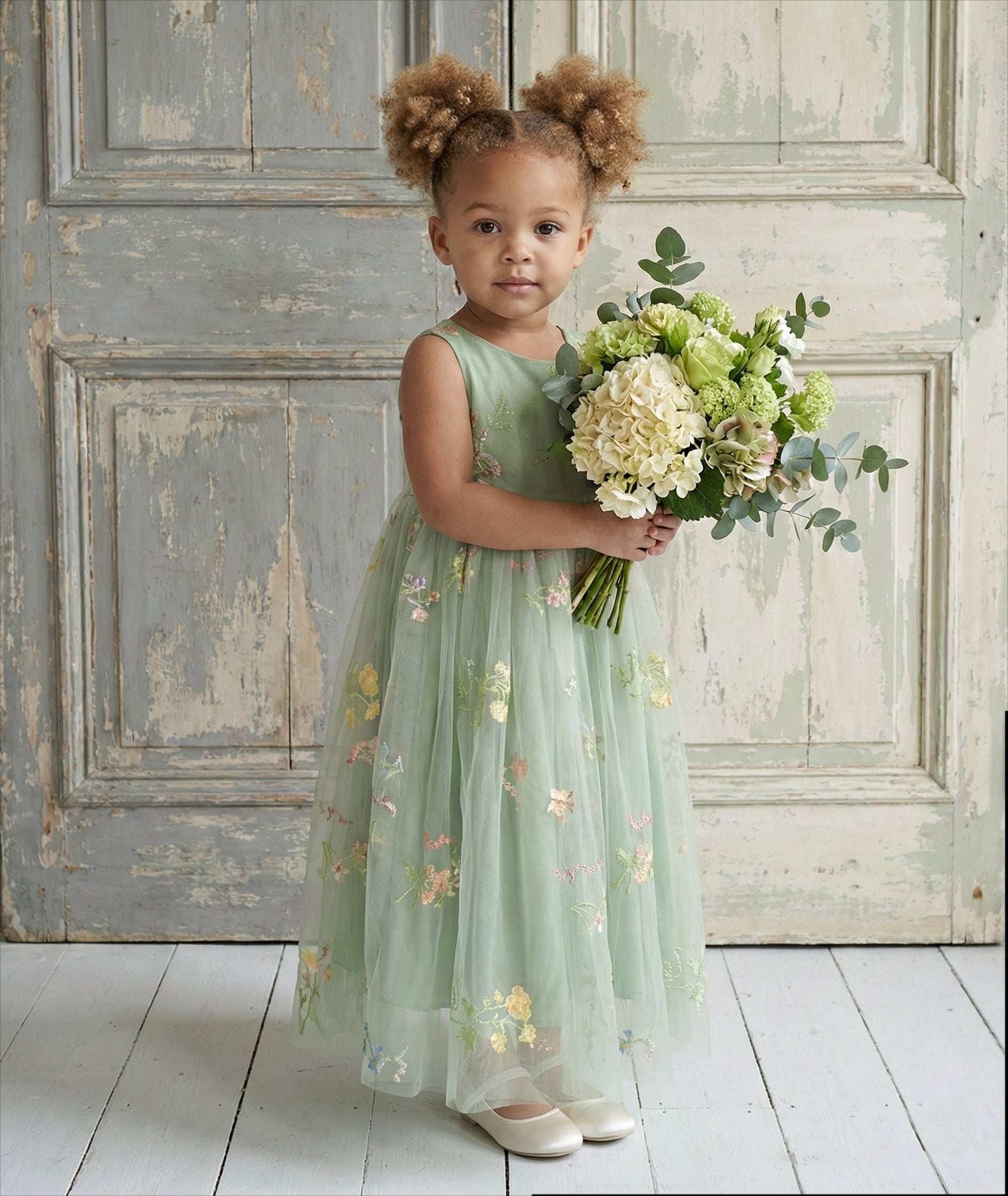 2Bunnies Girls' 12M-14yr Floral Garden Embroidered Tulle Strap Flower Girl Dress Maxi