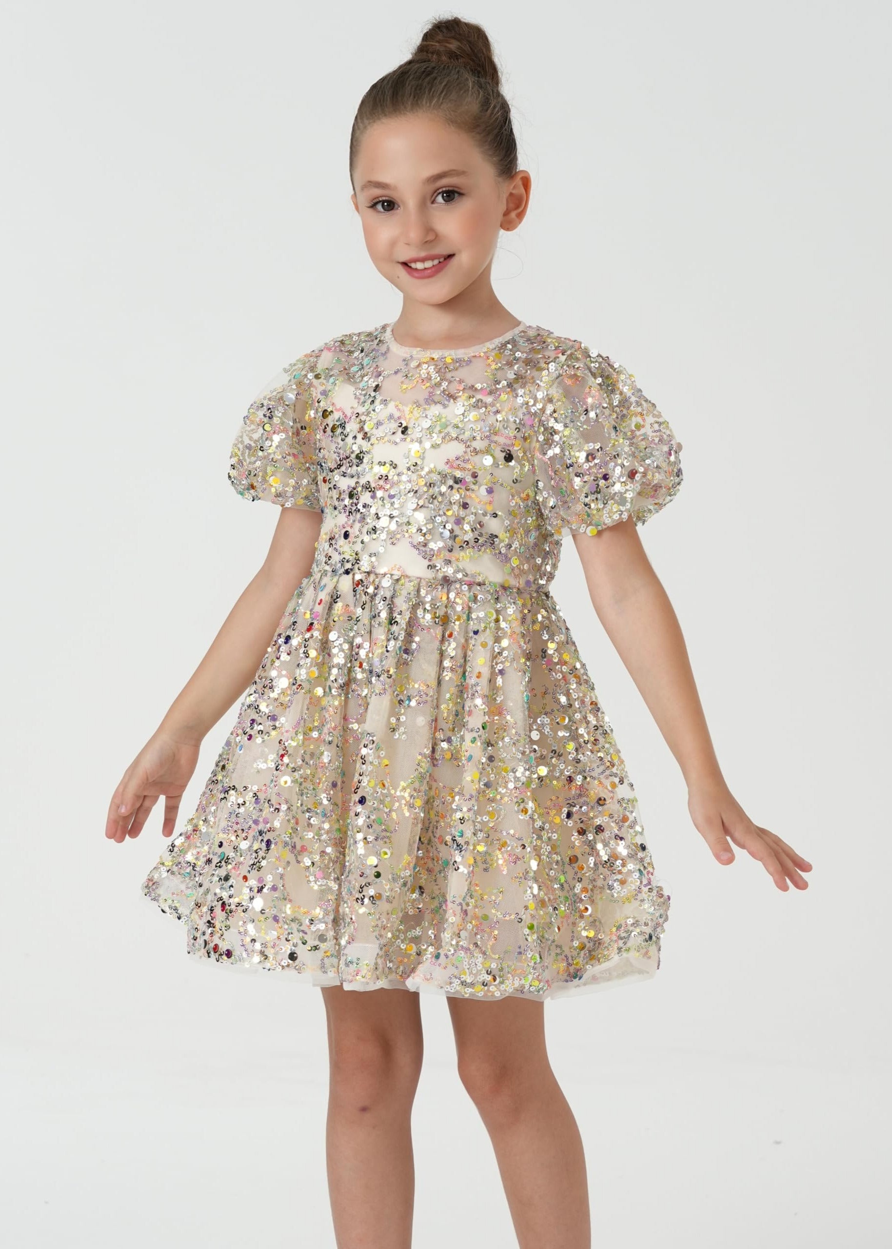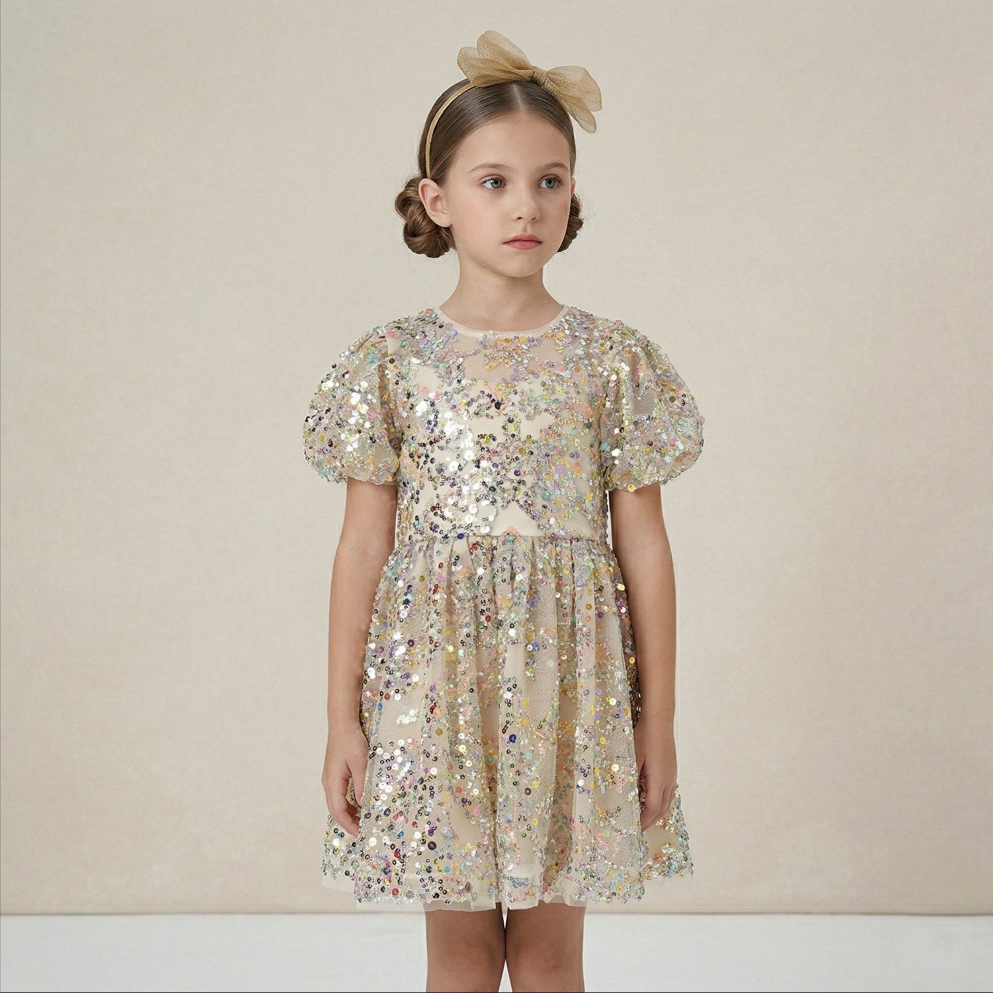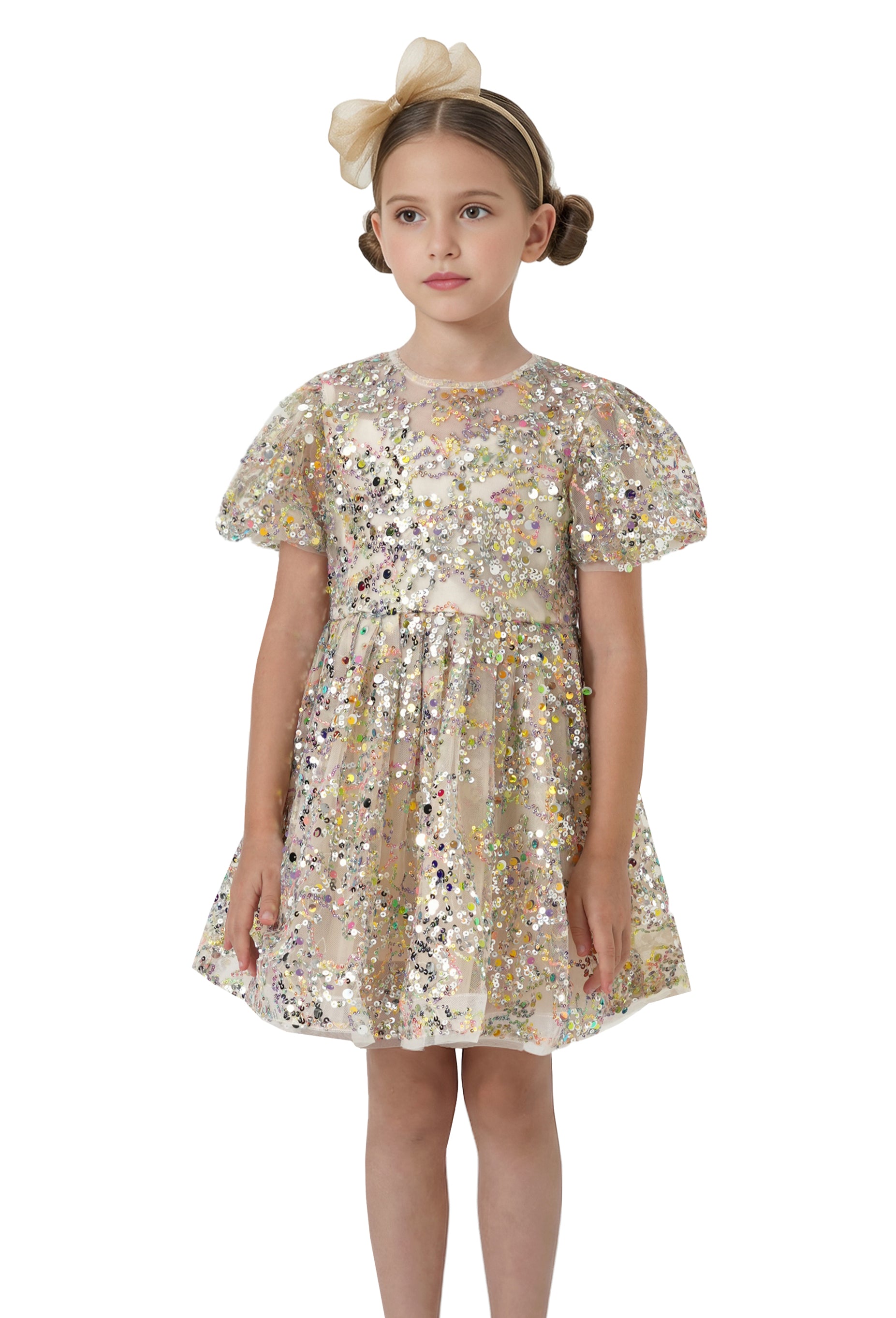 2Bunnies Girls' 2T-8Y Gold Shimmer Sparkle Sequin Puff Sleeve Holiday Party Birthday Girl Dress