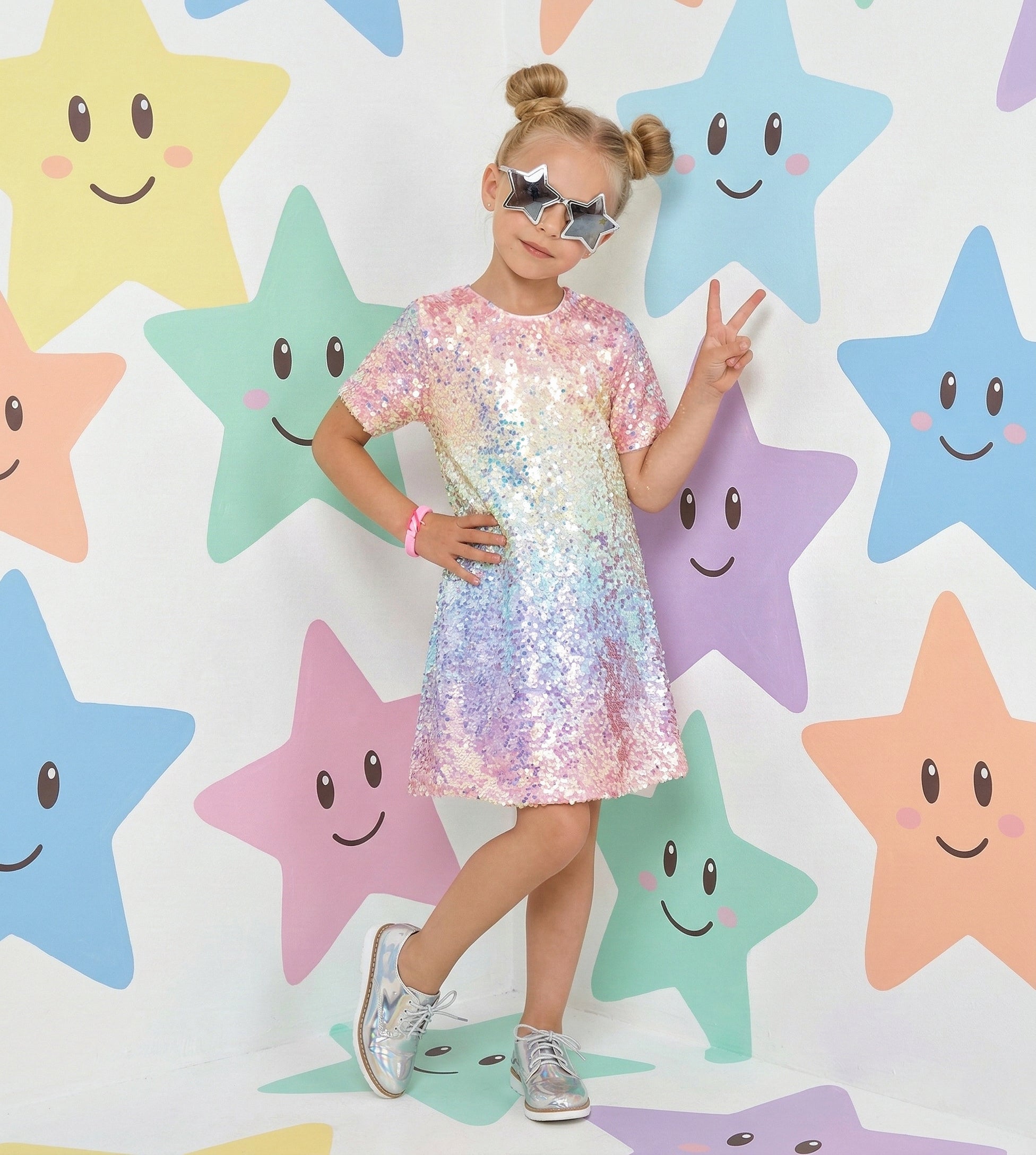 2Bunnies Girls' 3T-12yr Ombre Sequin Short Sleeve Dress