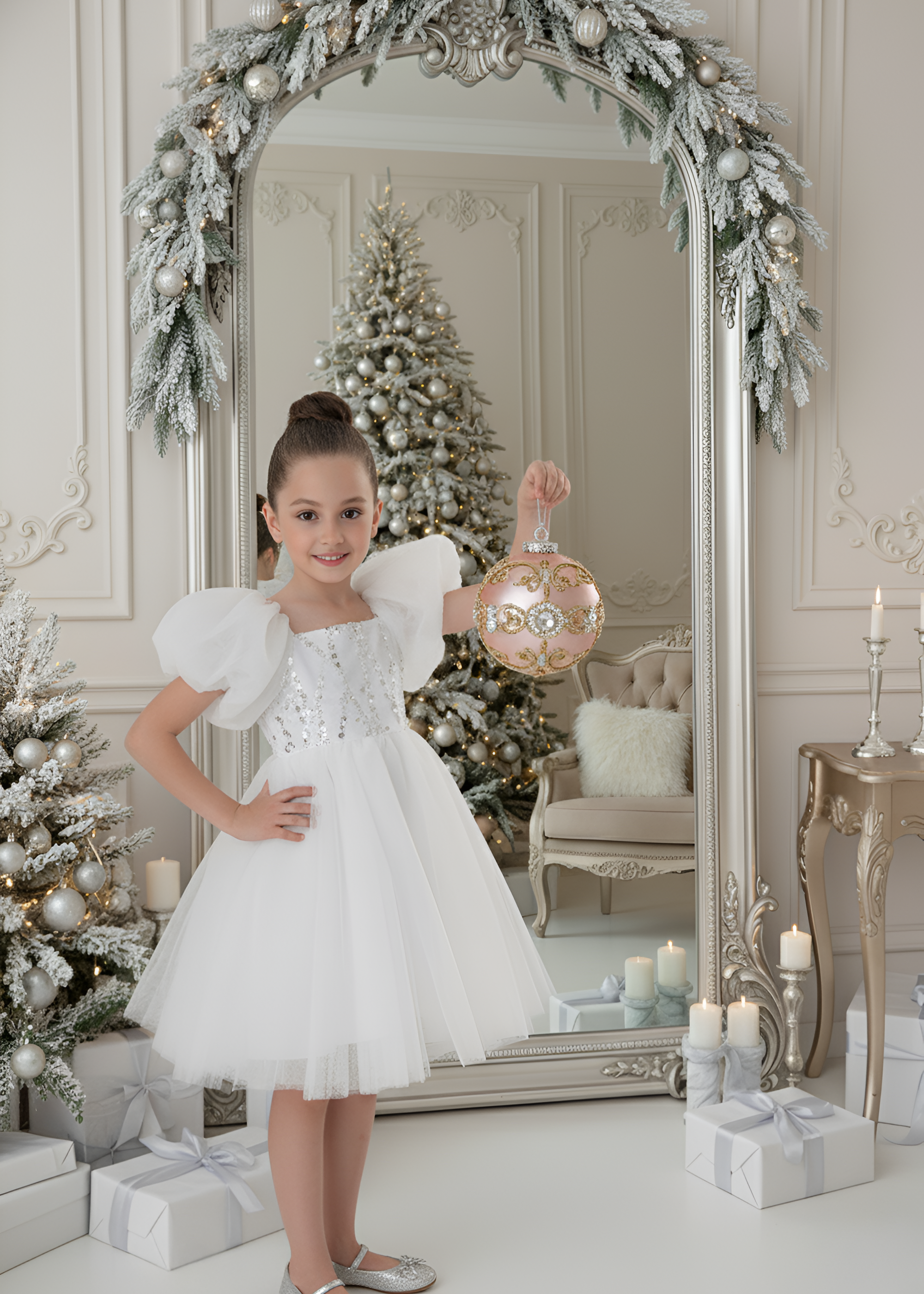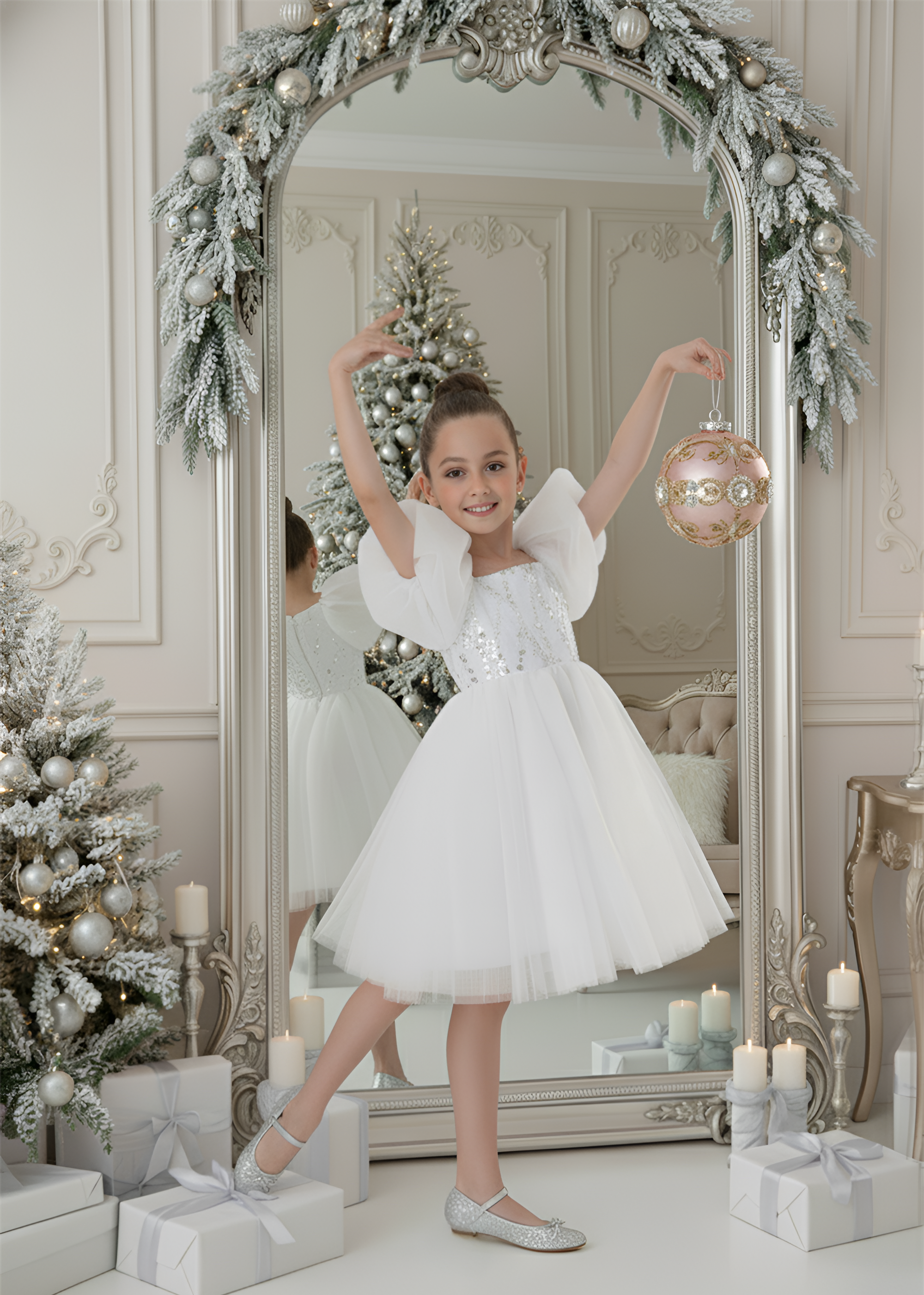 2Bunnies Girls Beaded Sequin Embellished Tulle Puff Sleeve Christmas Party Dress