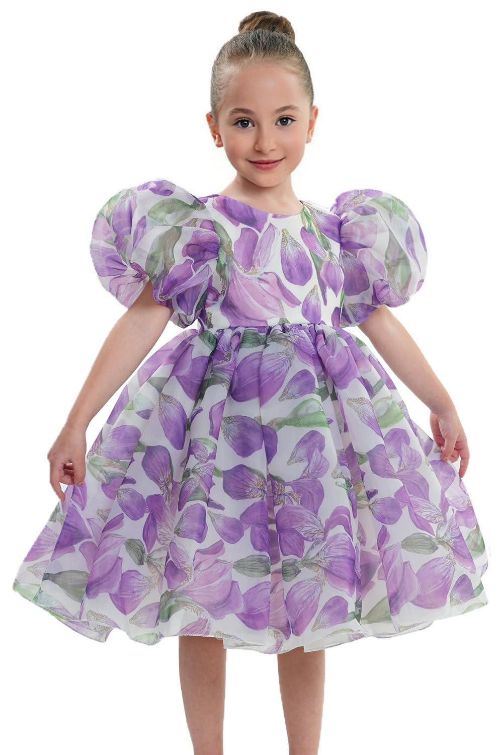 2Bunnies Girls' Organza Puff Sleeve Floral Babydoll Fit & Flare Dress