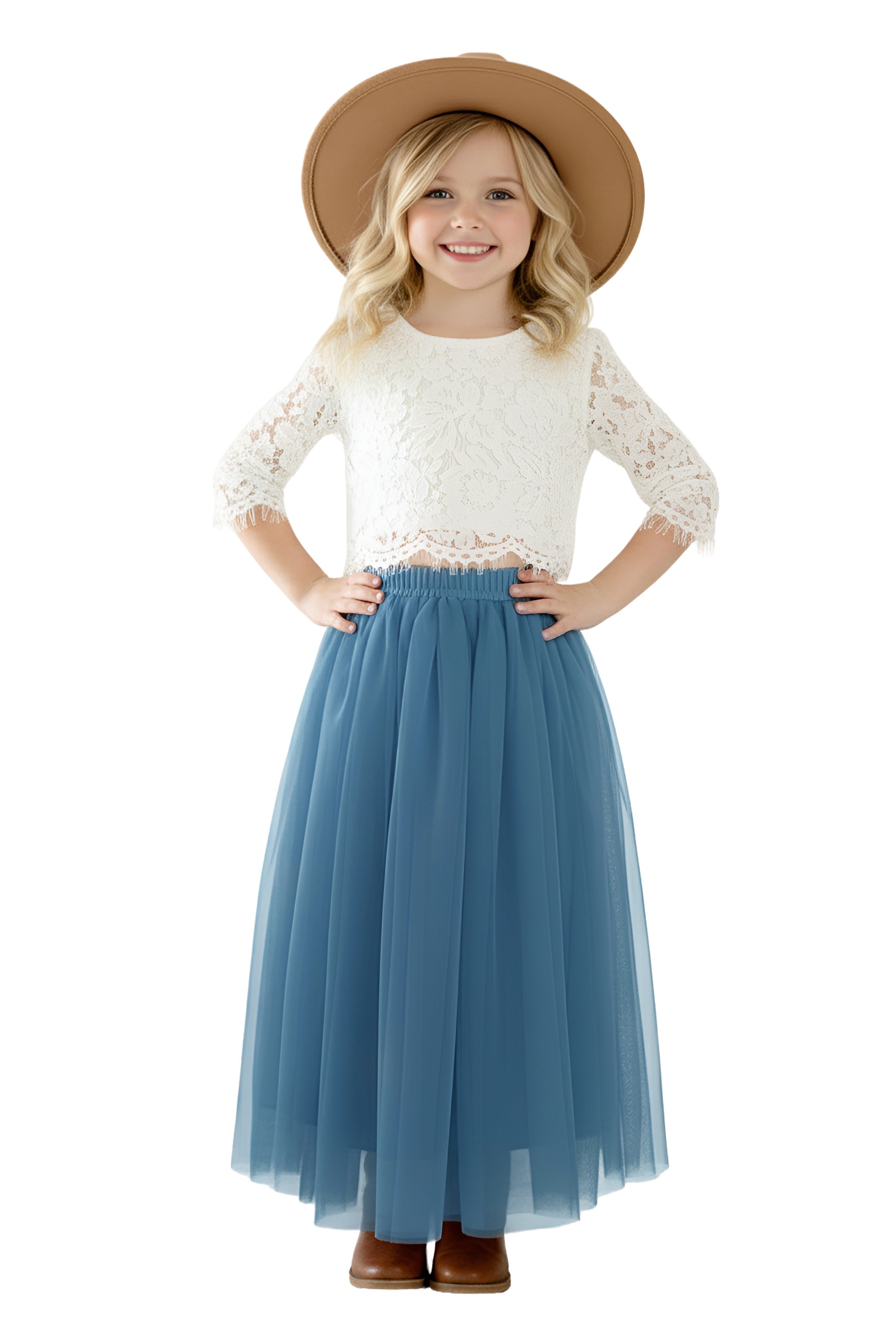 Scalloped Lace 2 Piece Girl Dress Set in Dusty Blue