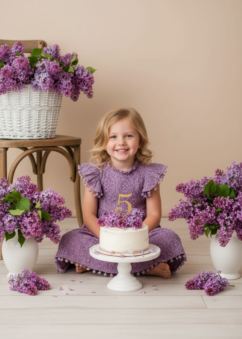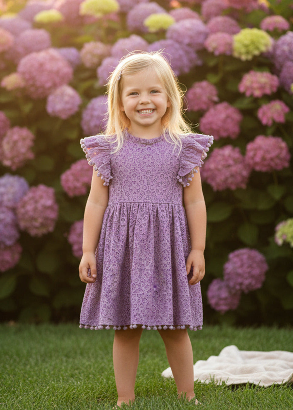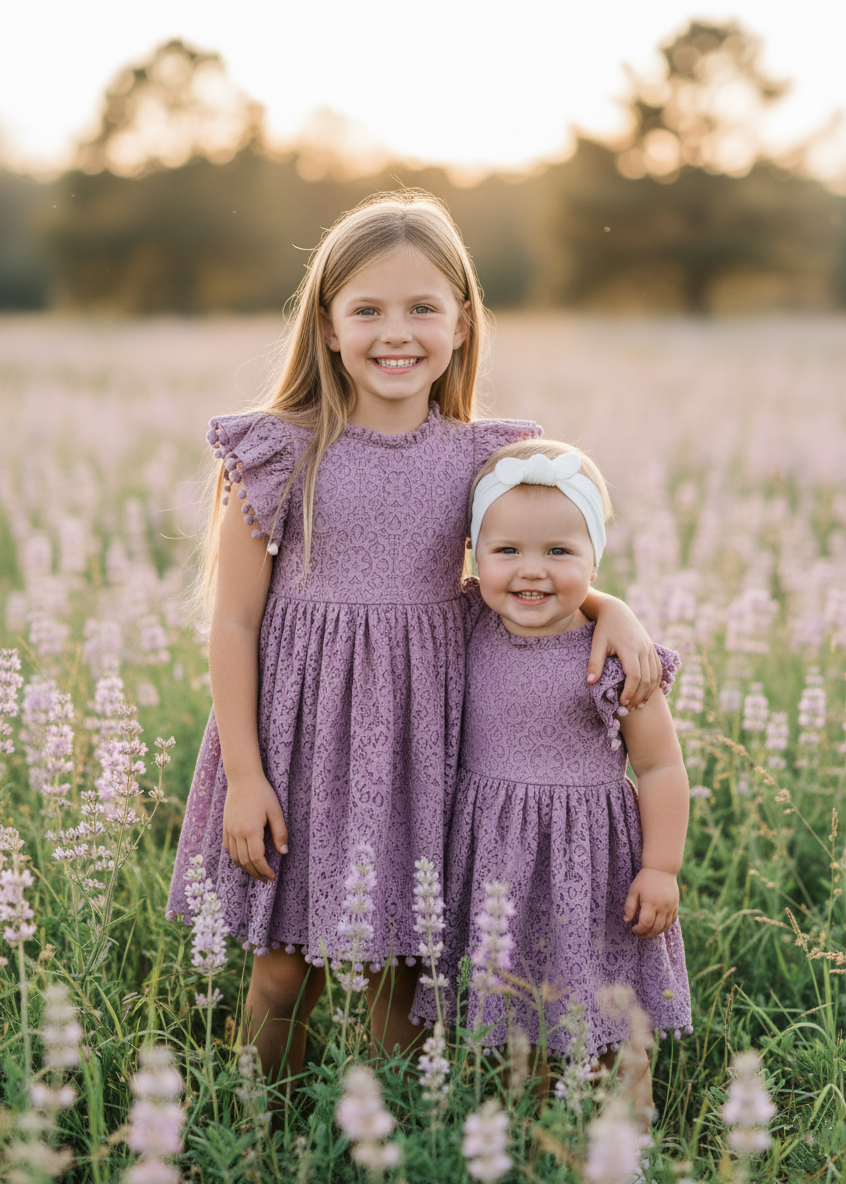 Sunflower Lace Pom Pom Trim Girl Dress in Mauve