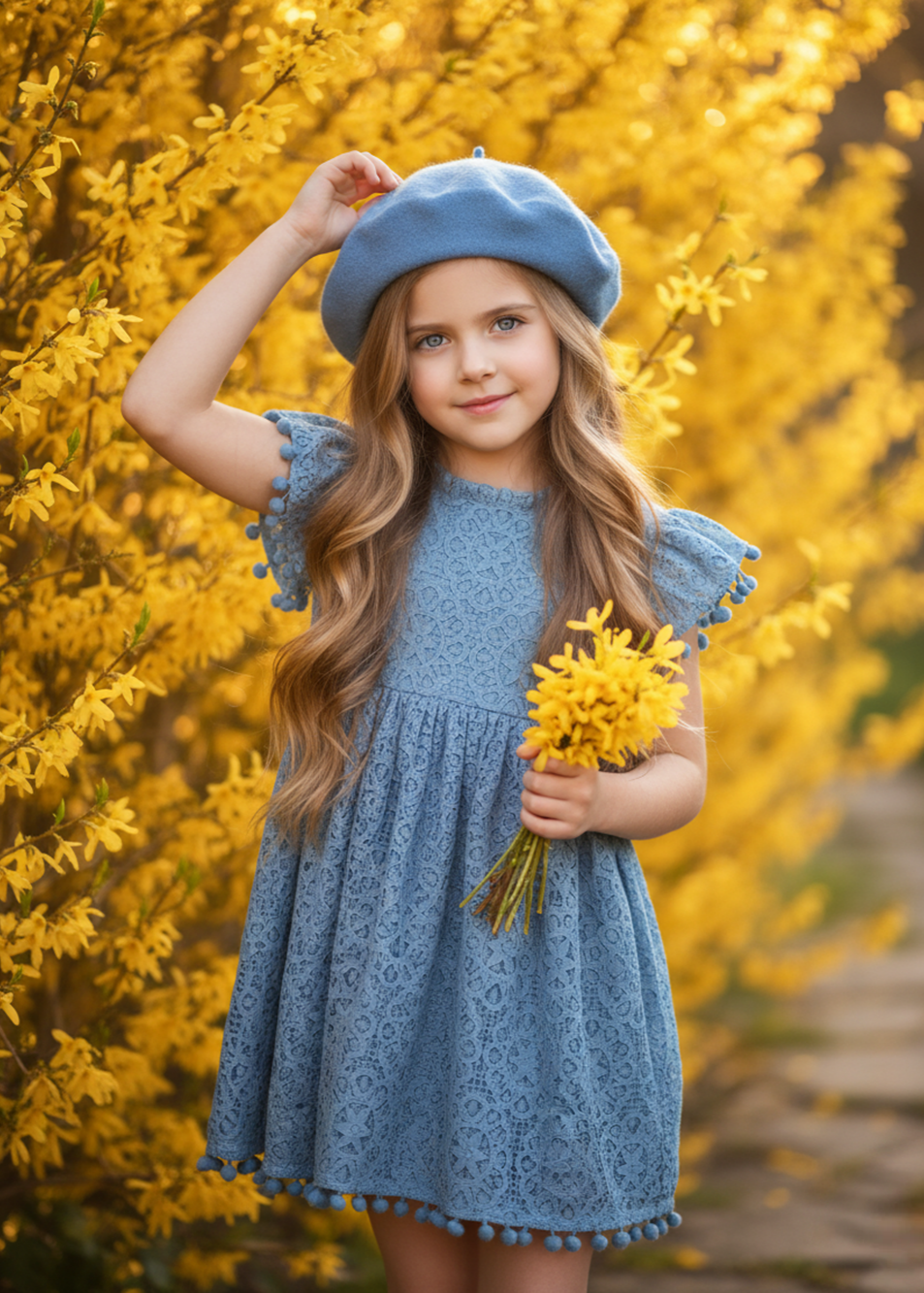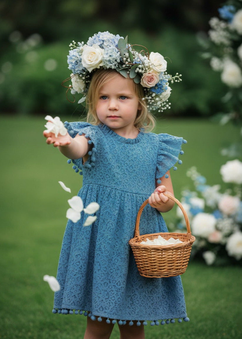 Sunflower Lace Pom Pom Trim Girl Dress in Smoky Blue