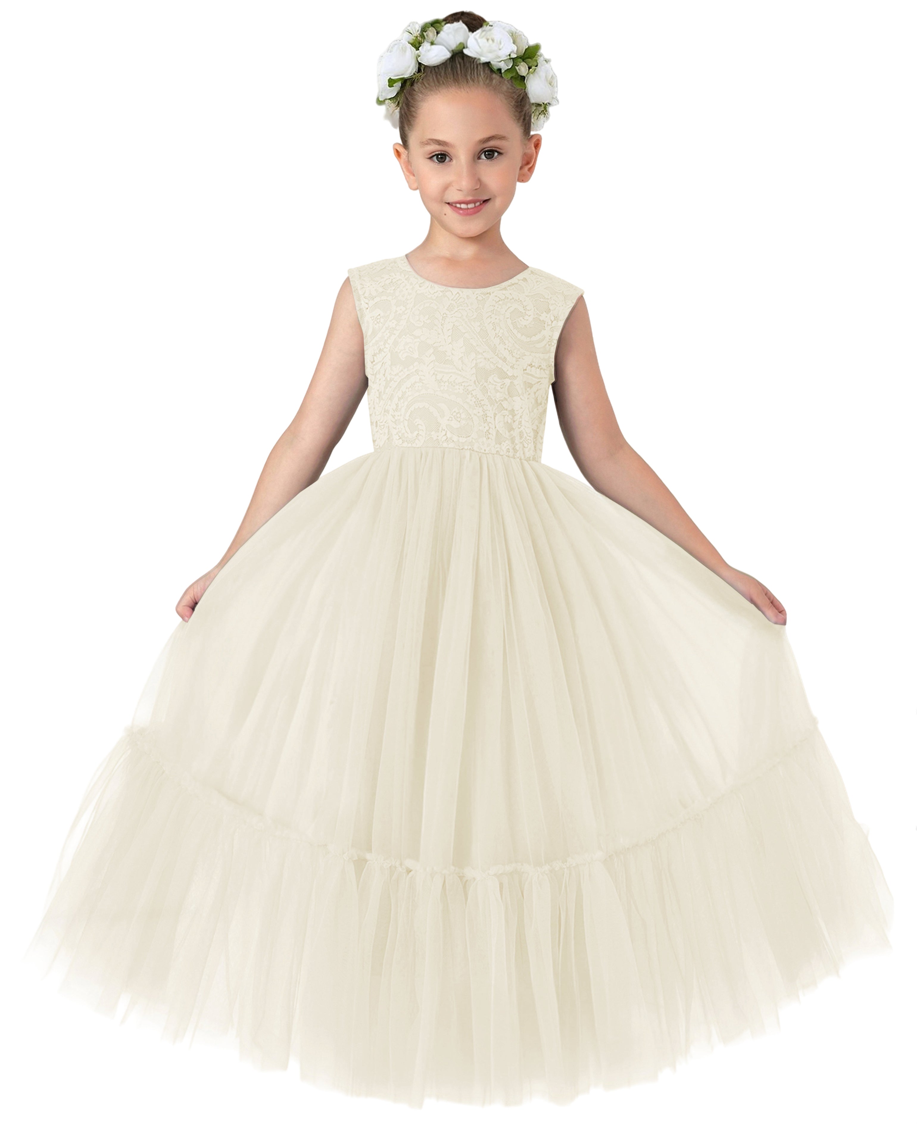 Girls' Paisley Lace Tulle Ruffled Maxi Flower Girl Dress in Ivory