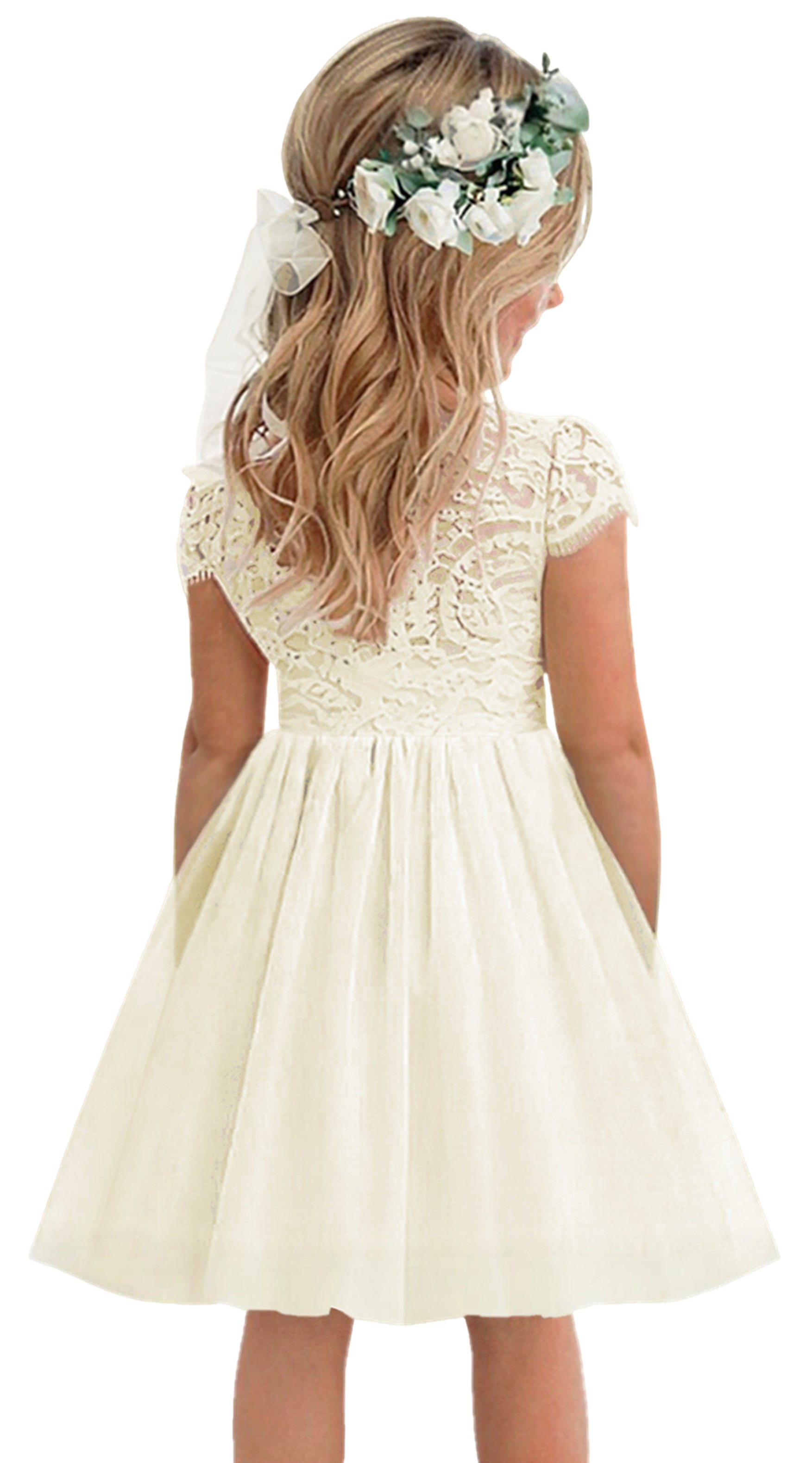 Girls' Paisley Lace Tulle Short Sleeve Knee Dress in Ivory