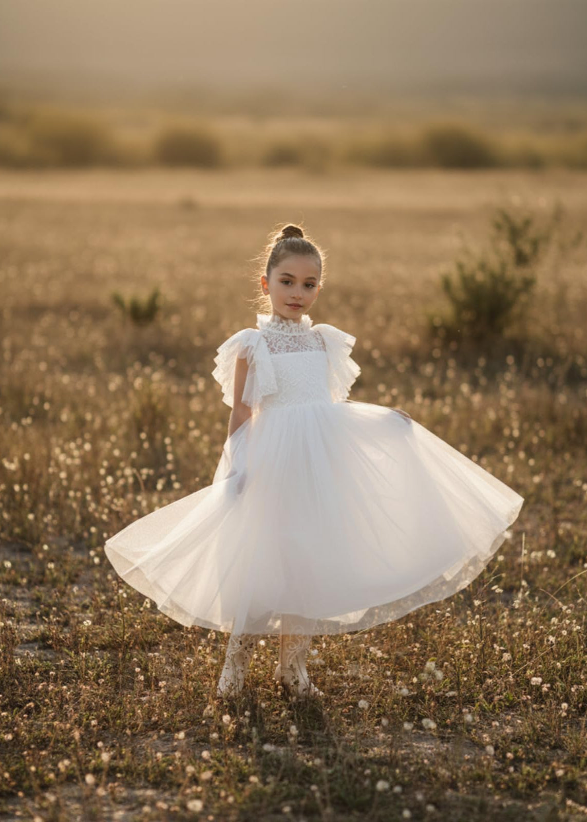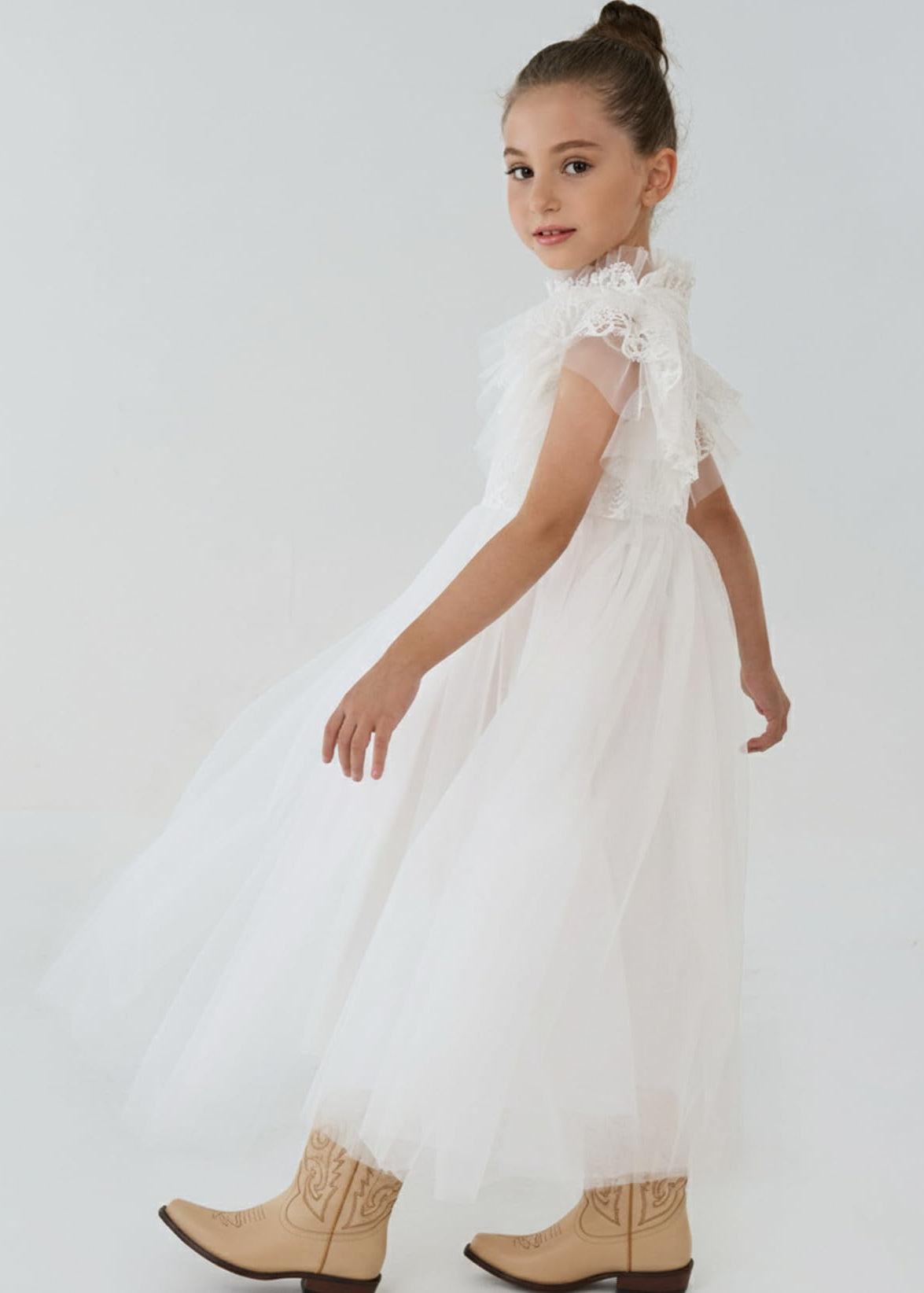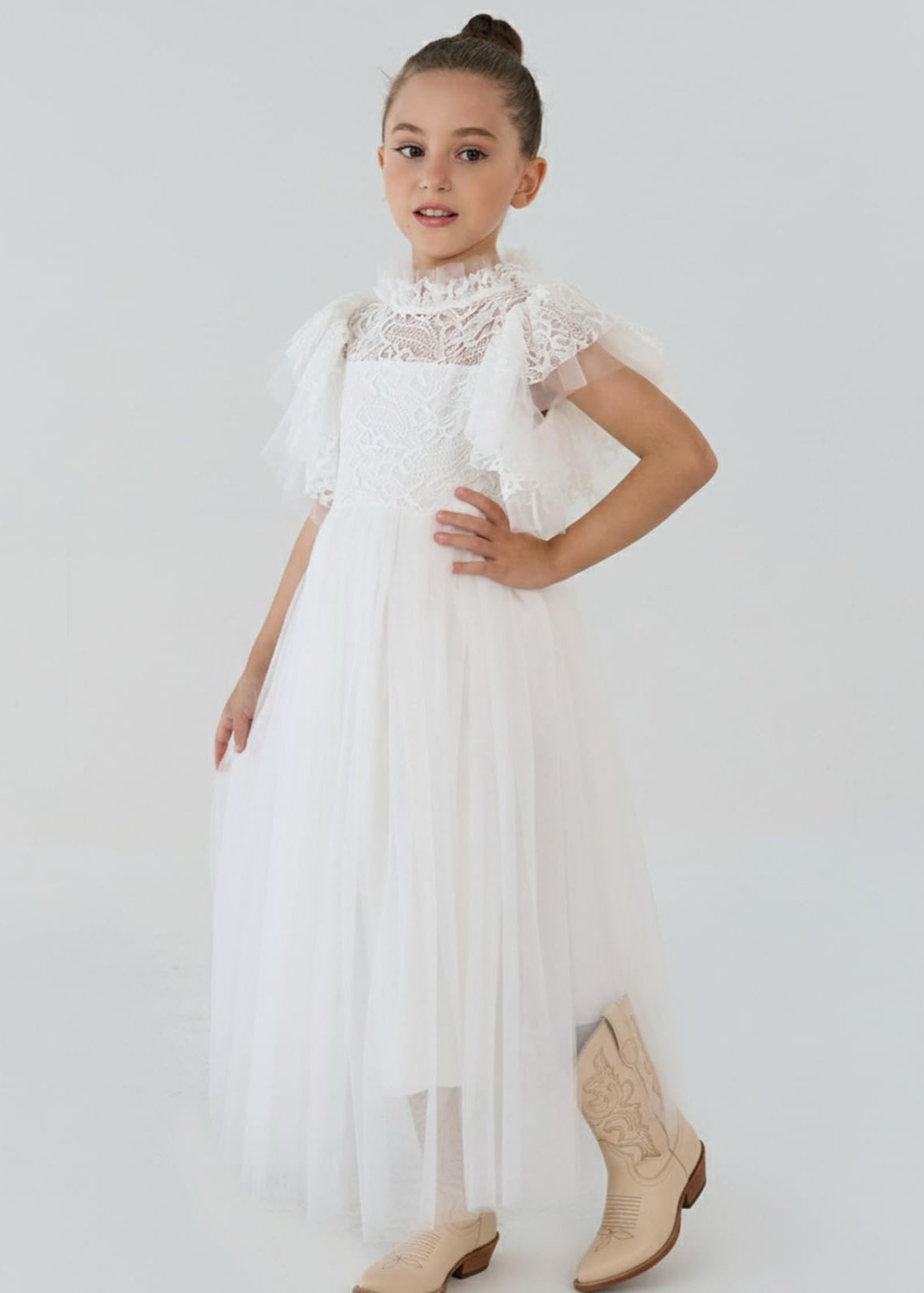 2Bunnies Girl Iris Floral Lace Tulle Flower Girl Dress in White
