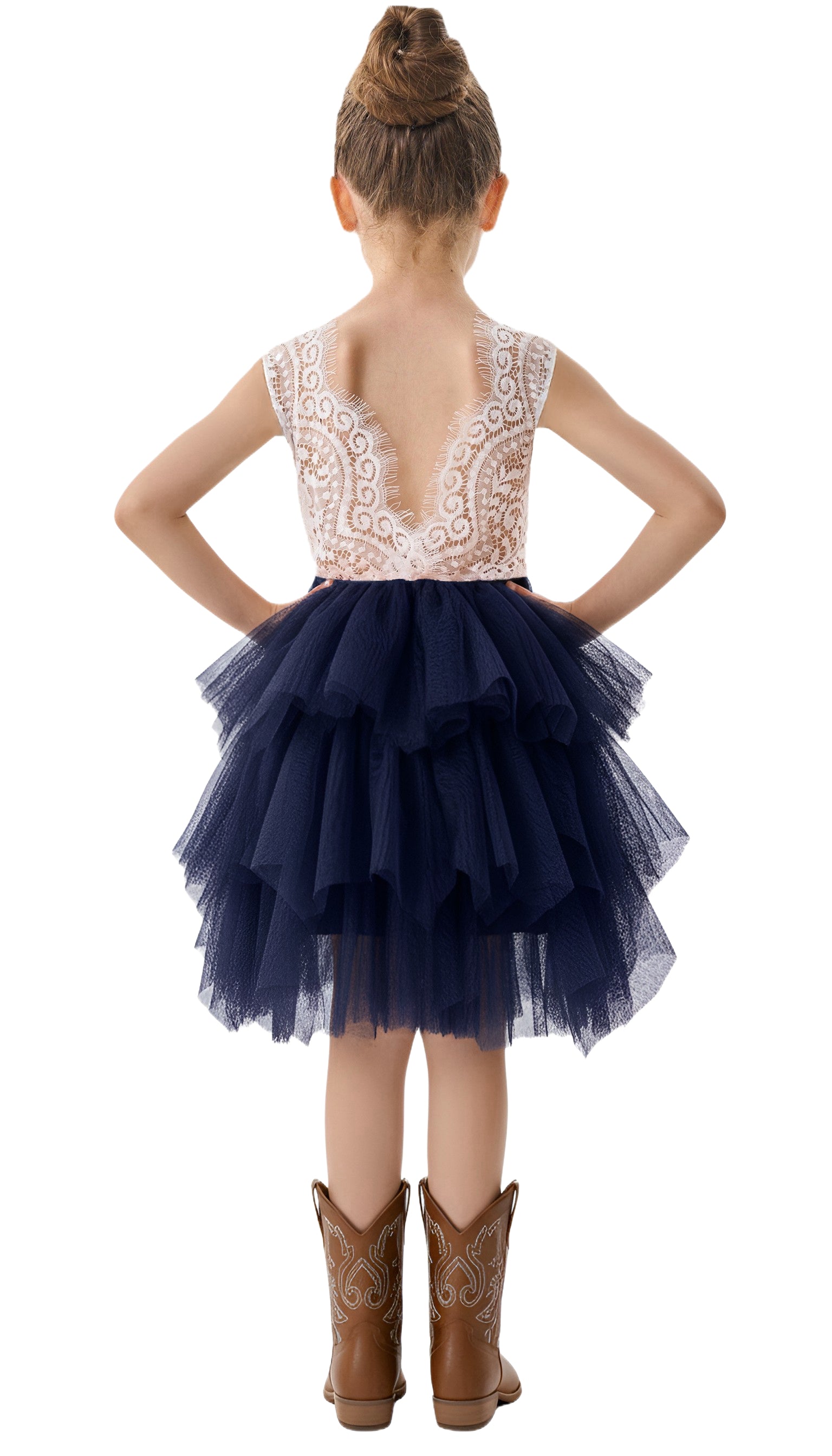 2Bunnies Girls' Peony Lace Tiered Sleeveless Knee Flower Girl Dress in Navy Blue