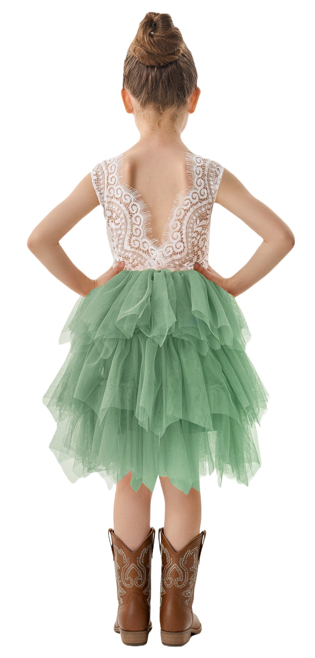 2Bunnies Girls' Peony Lace Tiered Sleeveless Knee Flower Girl Dress in Sage