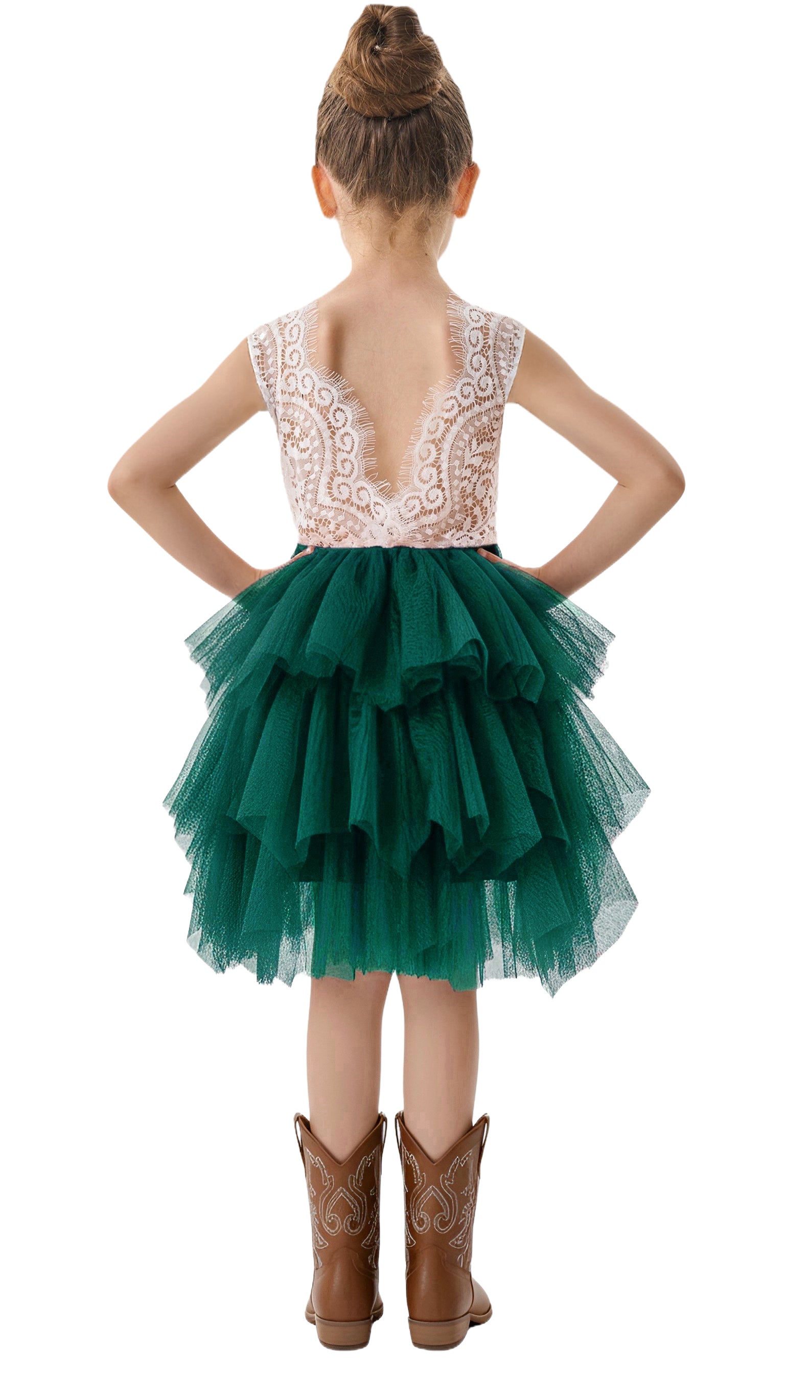 2Bunnies Girls' Peony Lace Tiered Sleeveless Knee Flower Girl Dress in Green