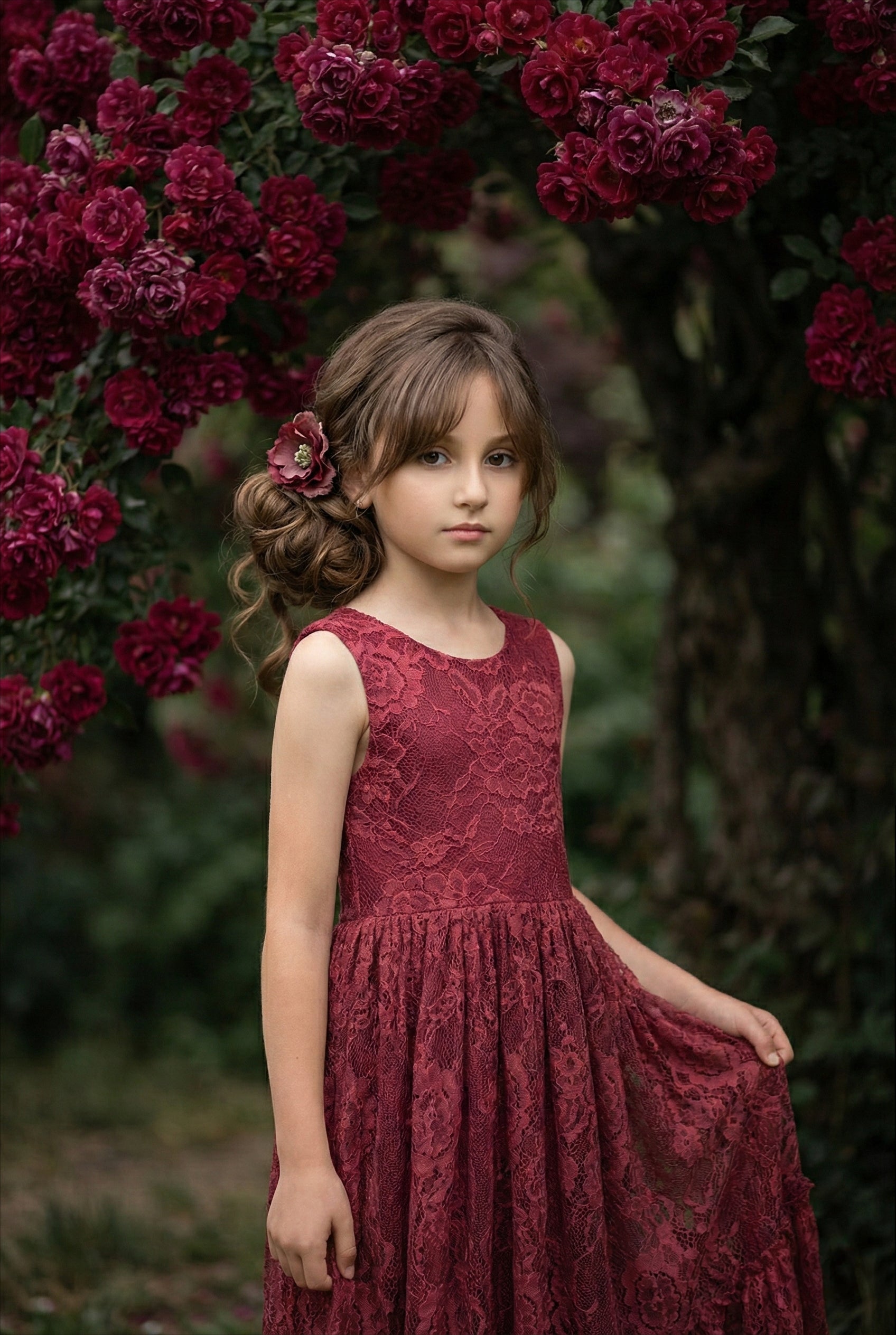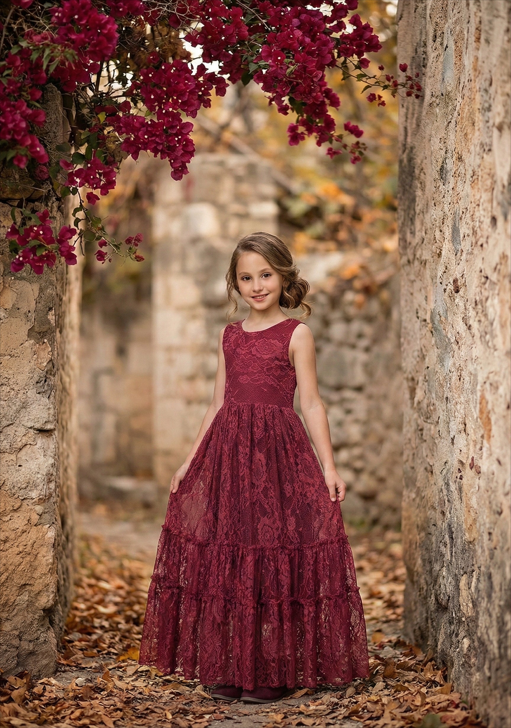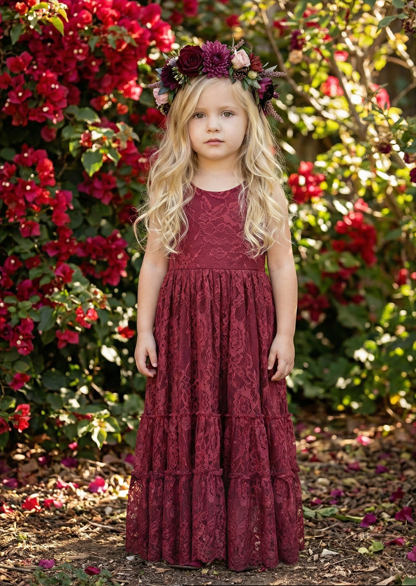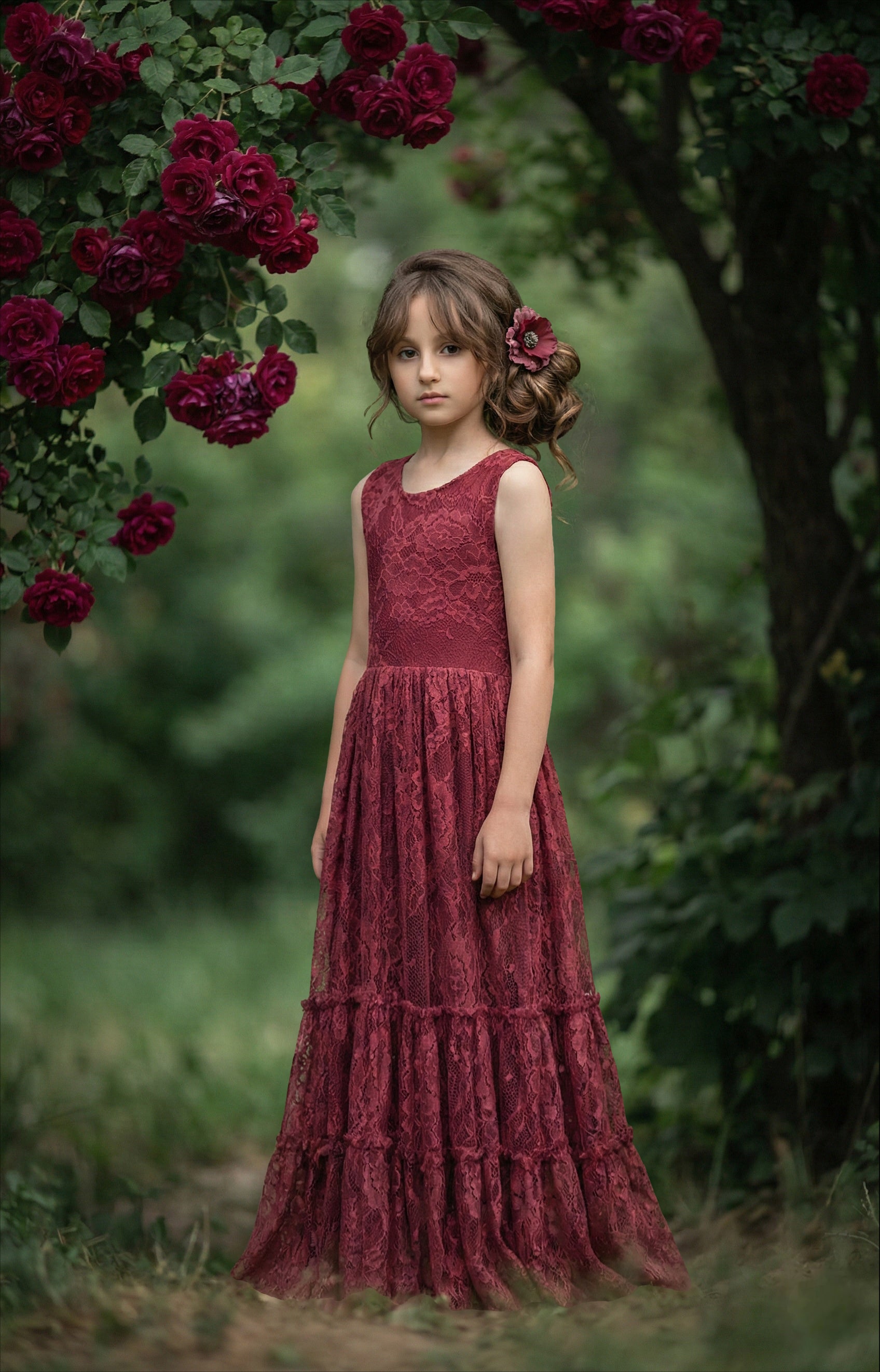2Bunnies Girls' 3T-10yr Rose Lace All-Over Lace Zip Back Boho Garden Rustic Flower Girl Dress