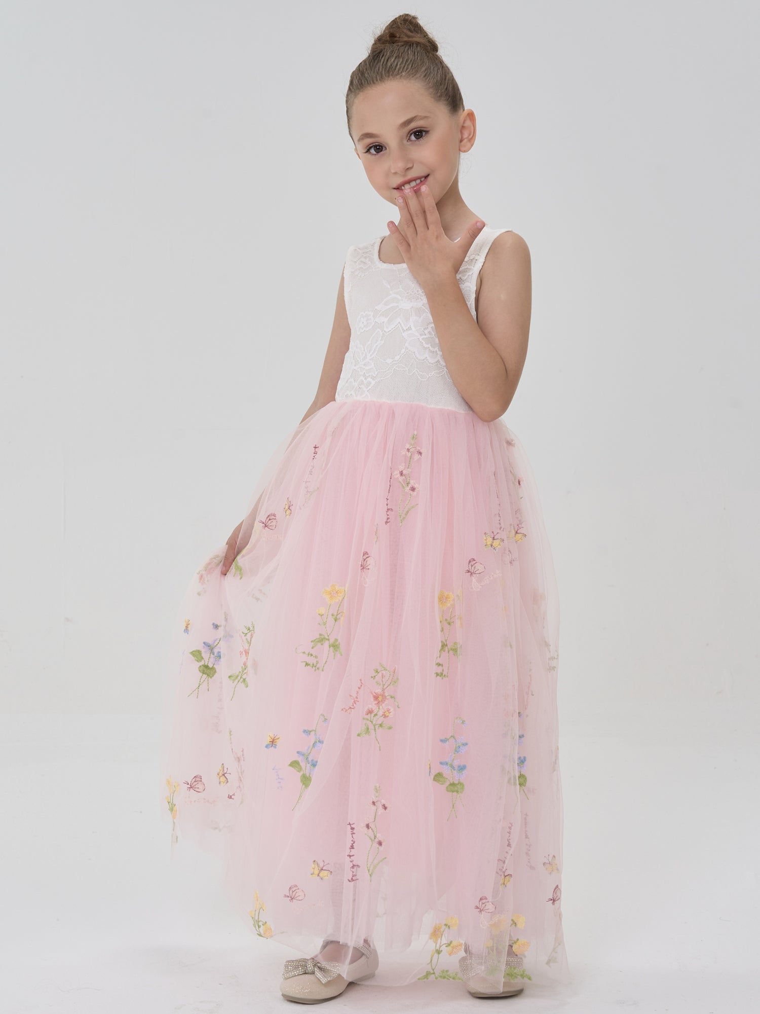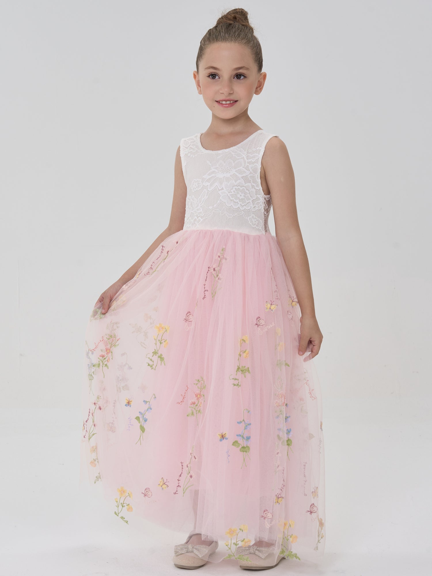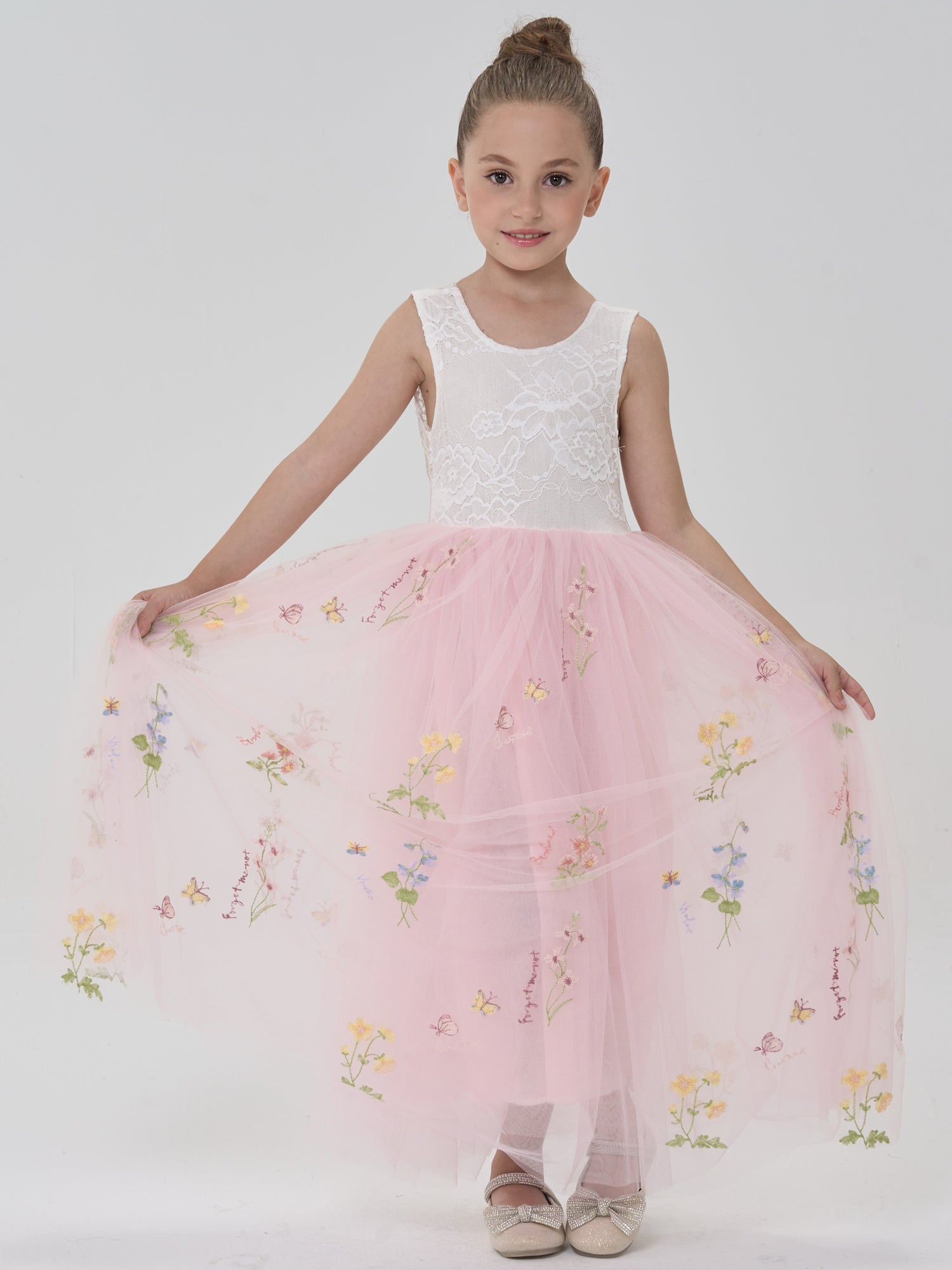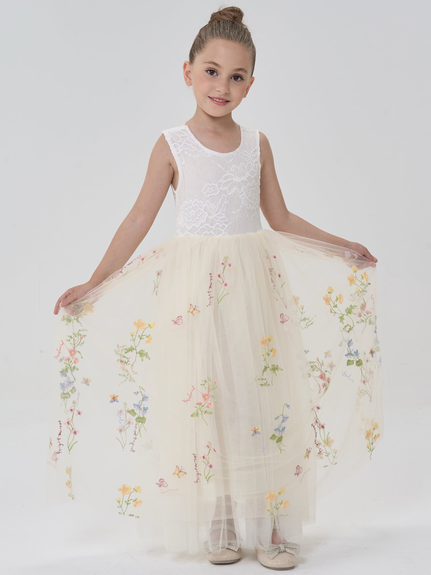 2Bunnies Girls 3-8Y Floral Embroidered Tulle Lace Sleeveless Maxi Flower Girl Dress