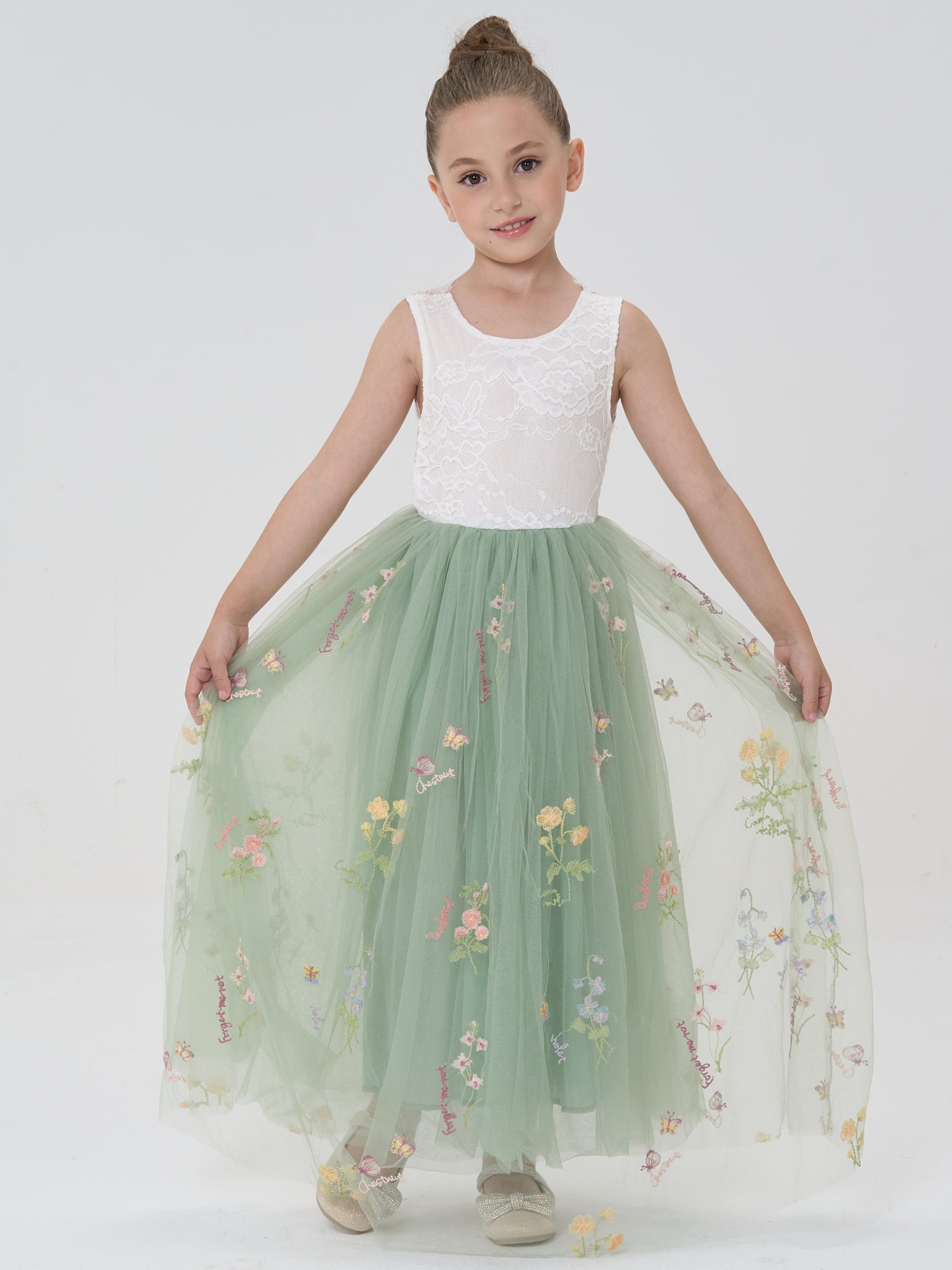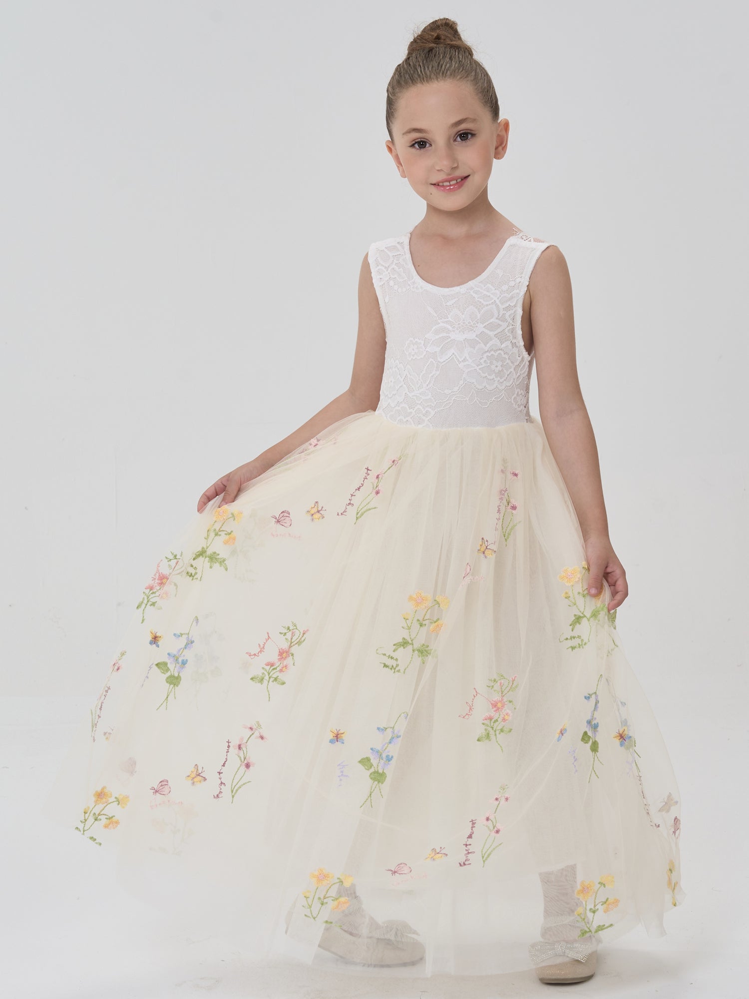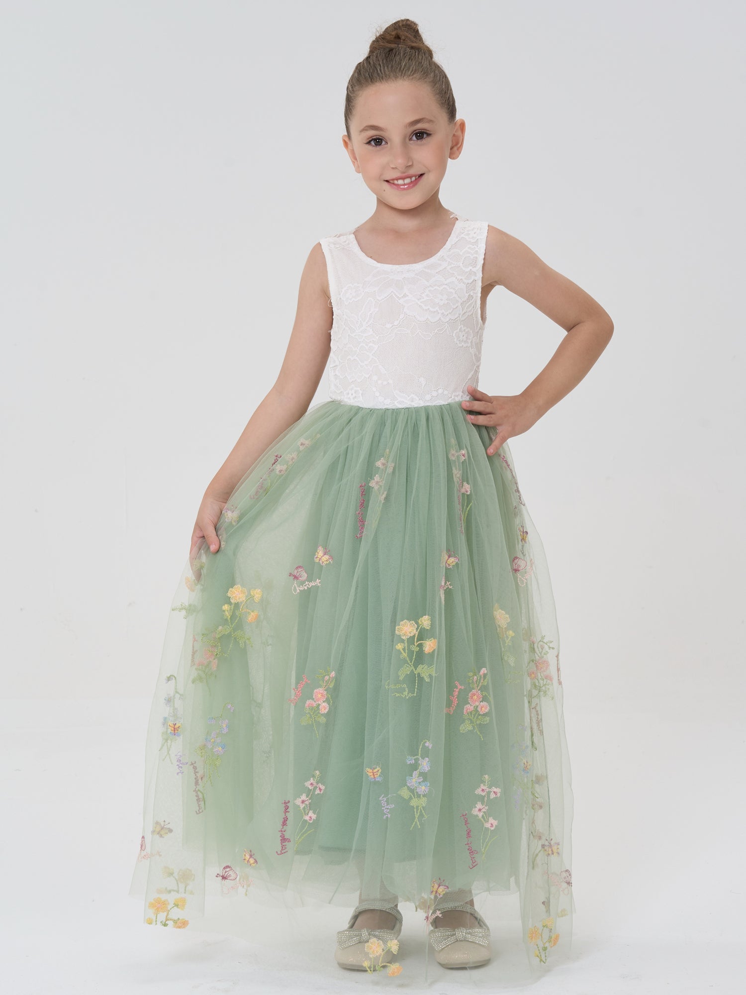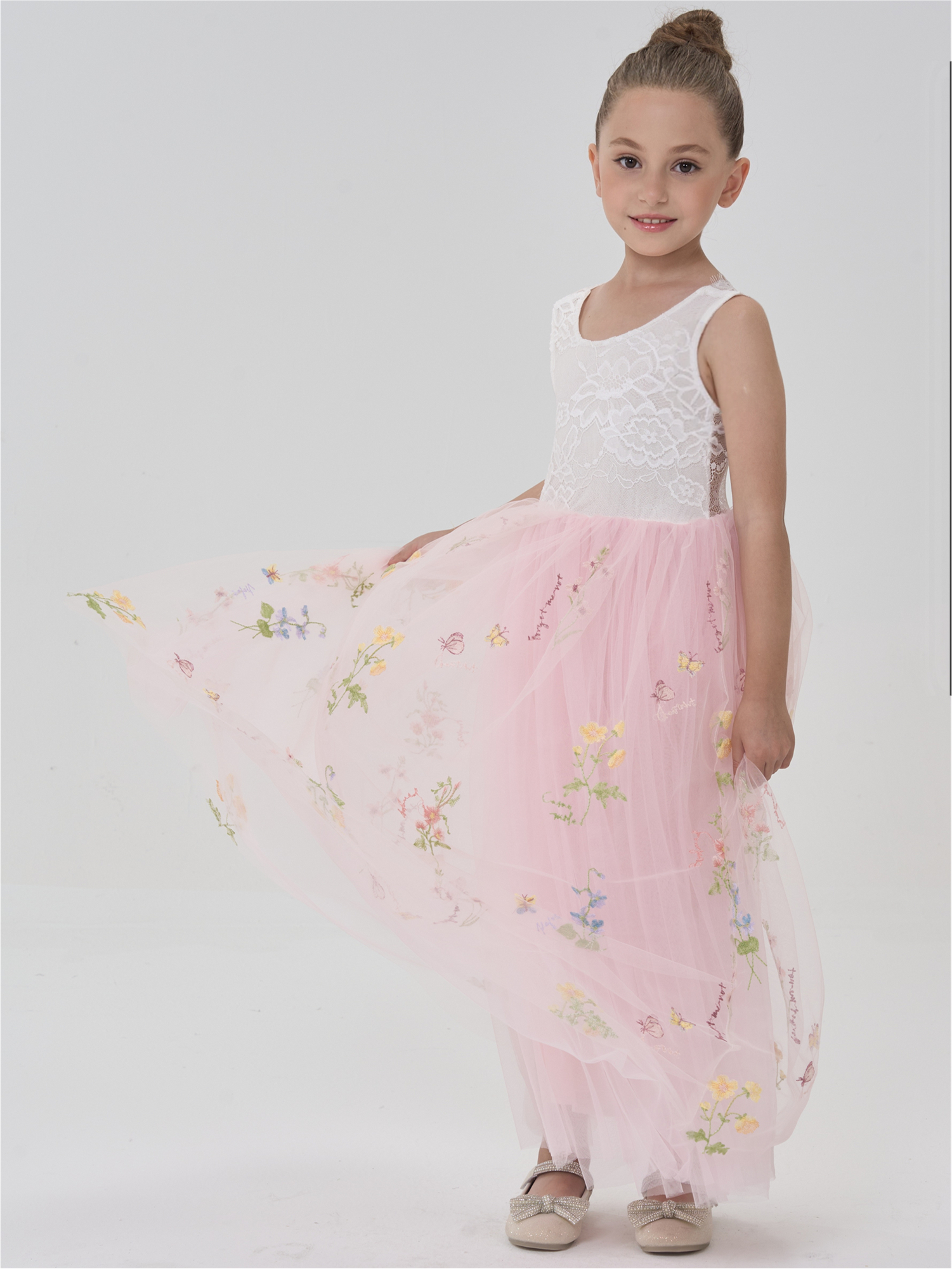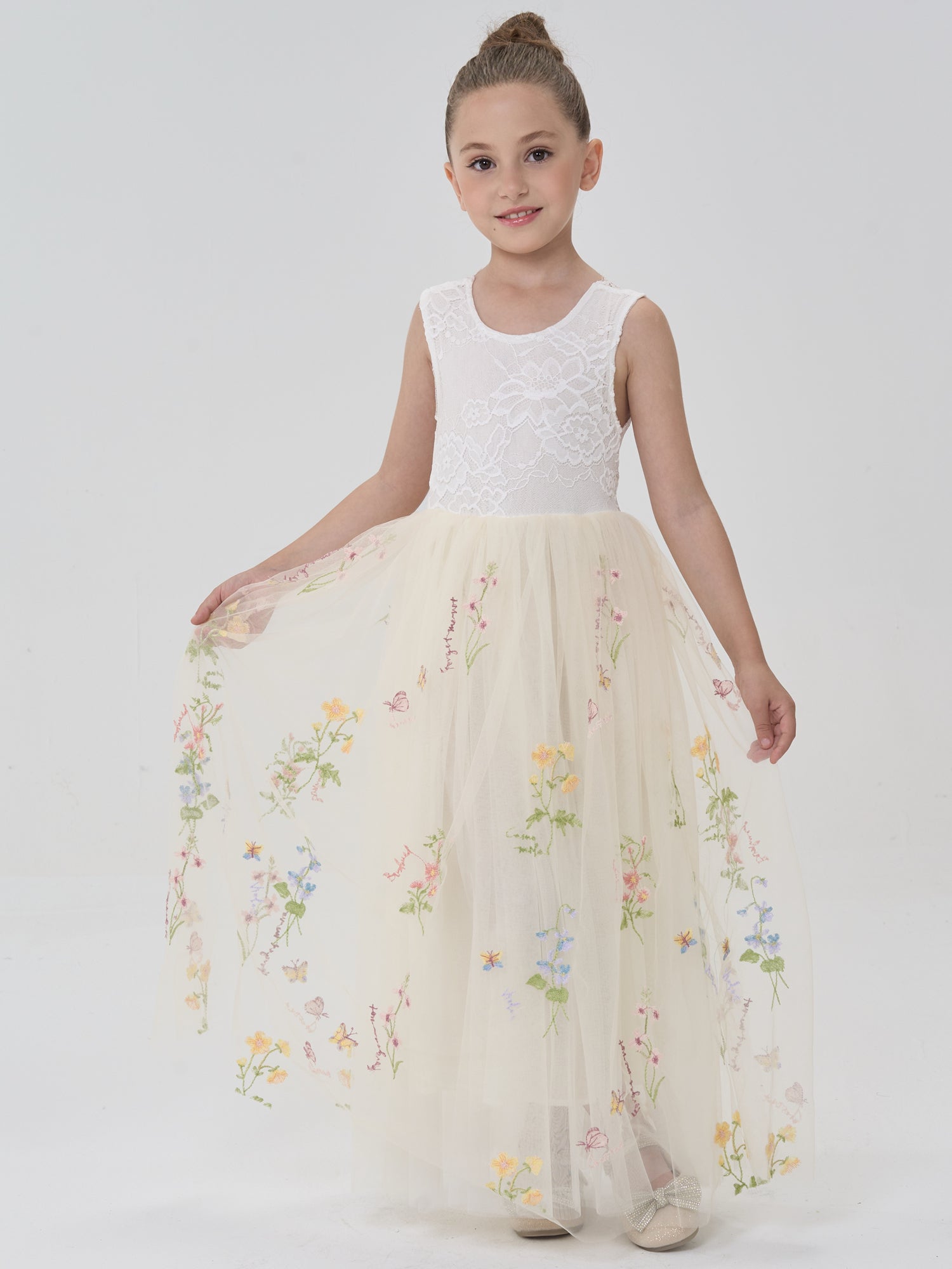 2Bunnies Girls 3-8Y Floral Embroidered Tulle Lace Sleeveless Maxi Flower Girl Dress