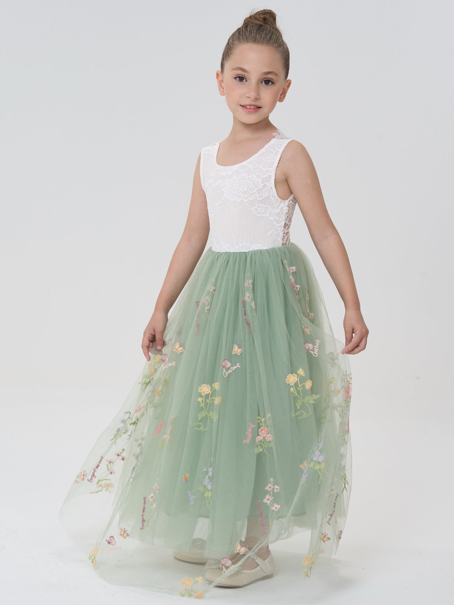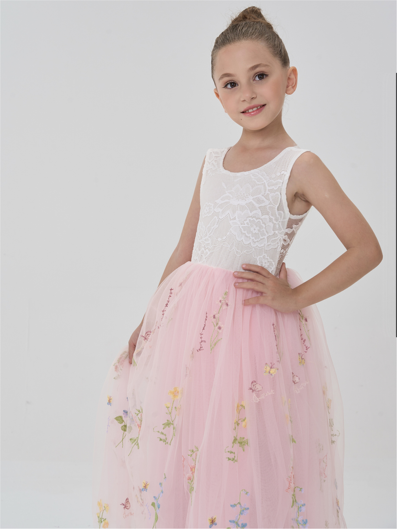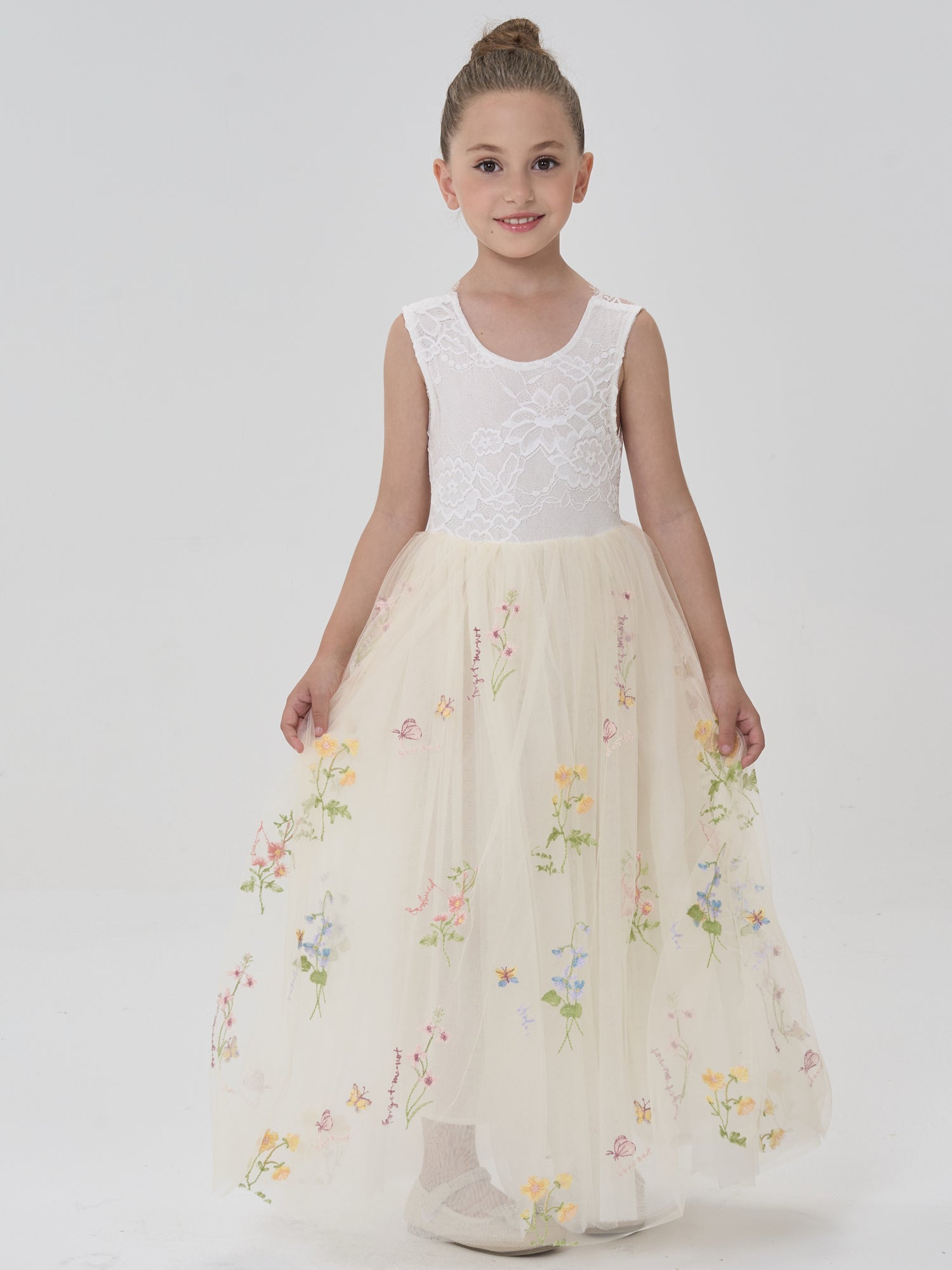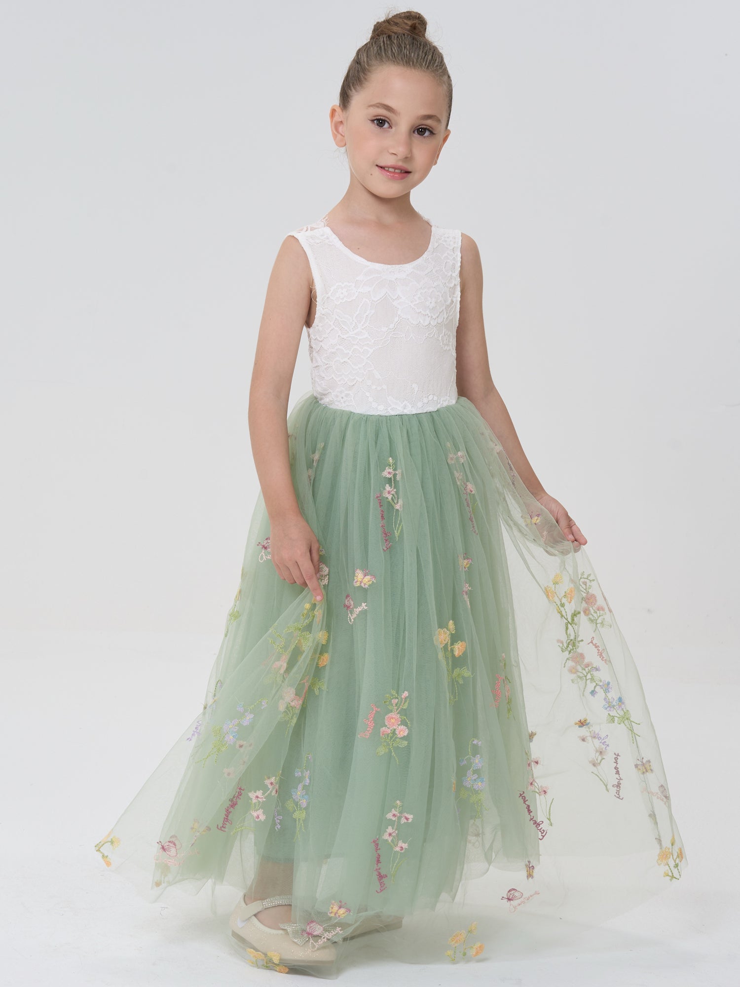 2Bunnies Girls 3-8Y Floral Embroidered Tulle Lace Sleeveless Maxi Flower Girl Dress