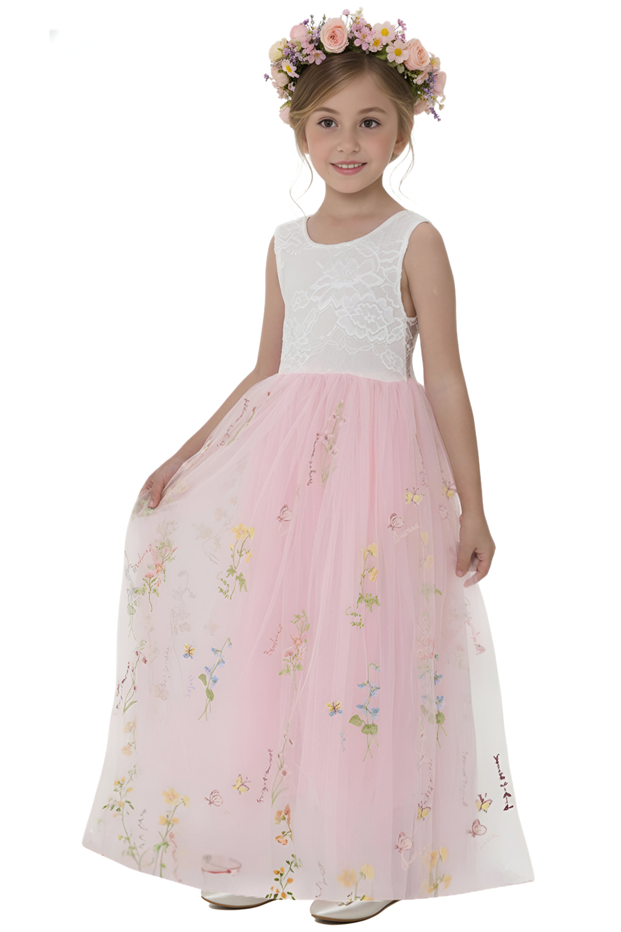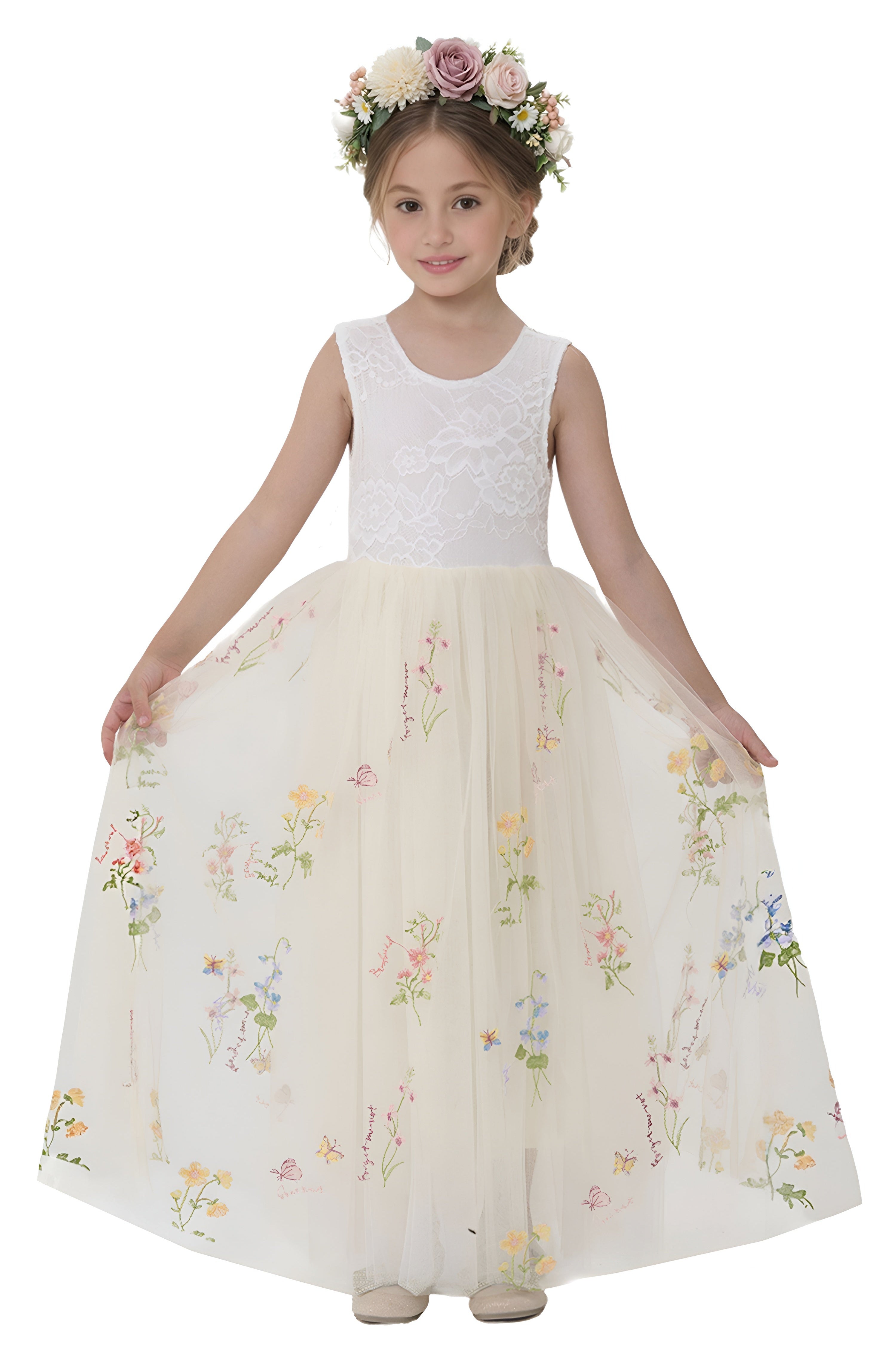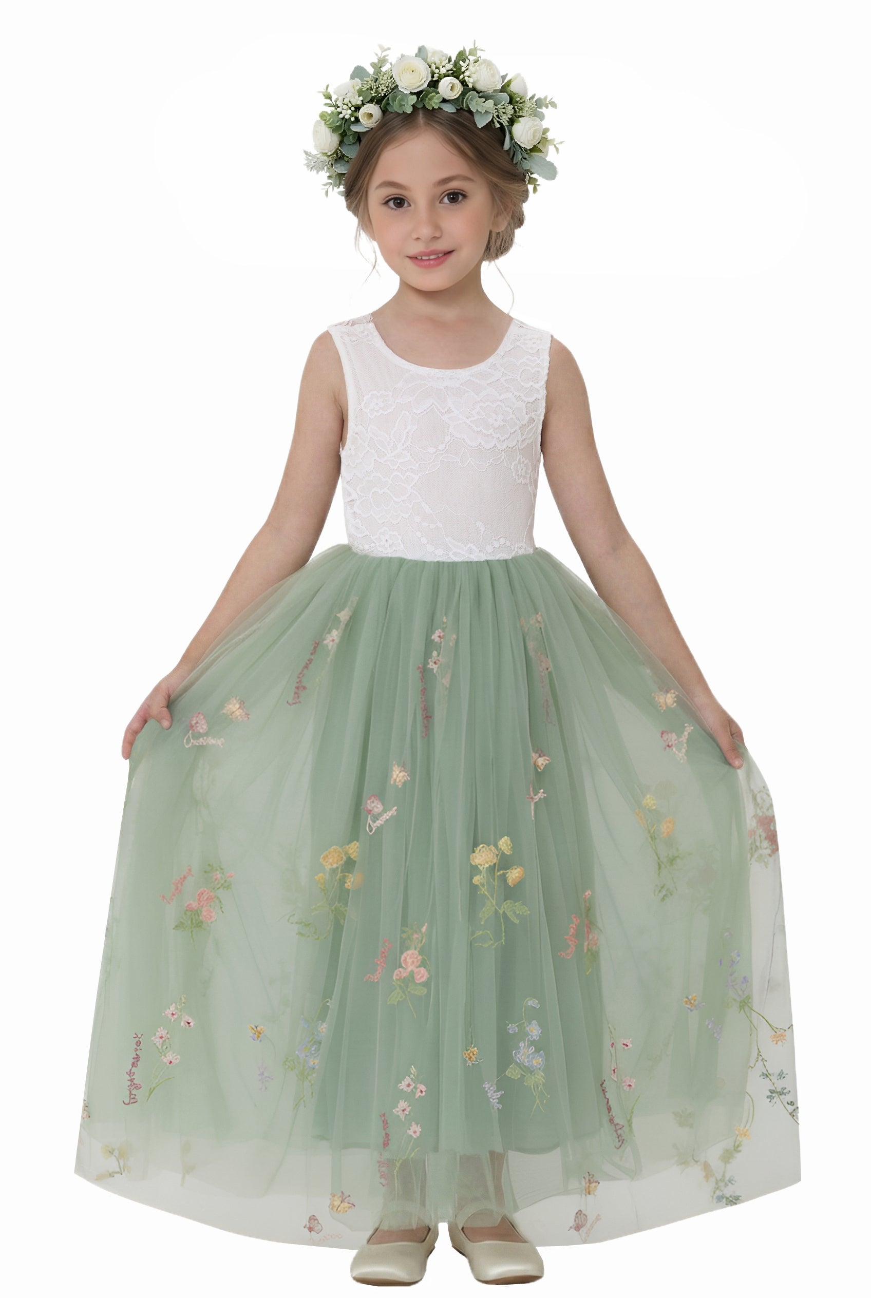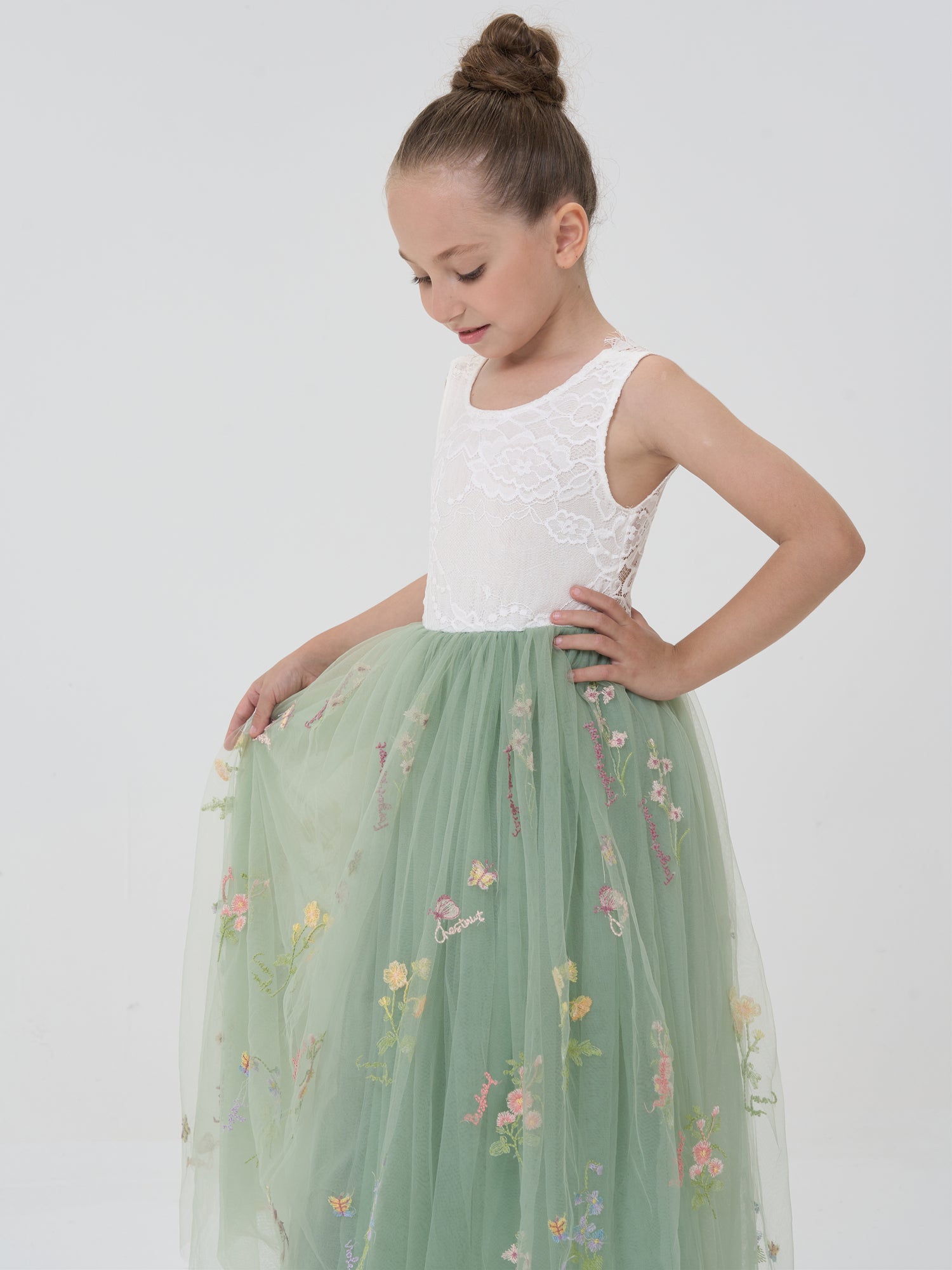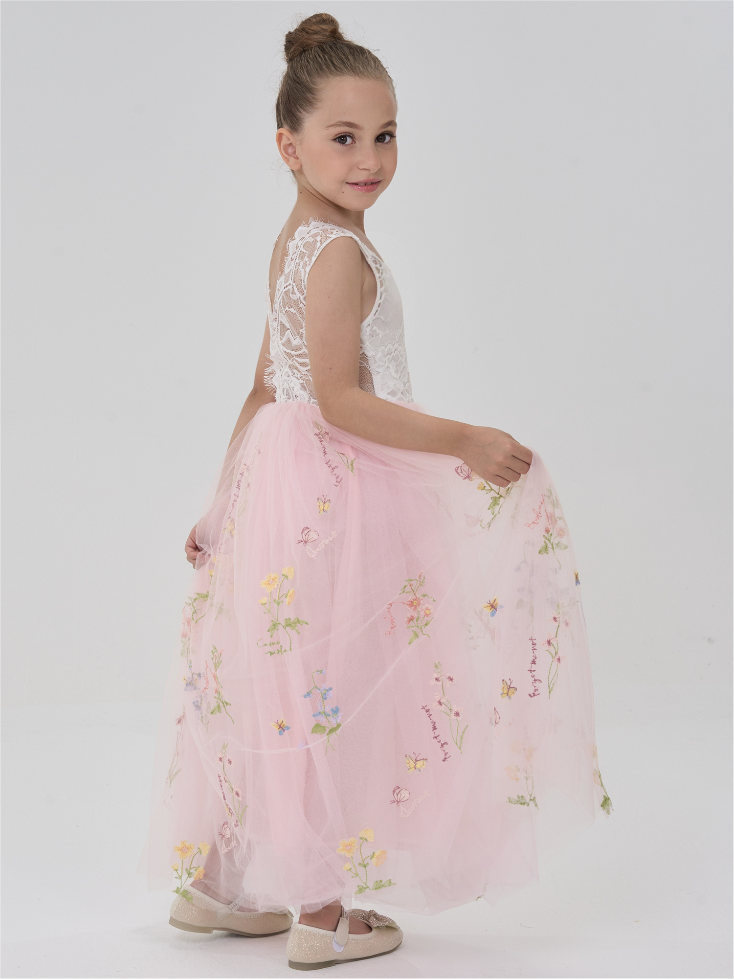2Bunnies Girls 3-8Y Floral Embroidered Tulle Lace Sleeveless Maxi Flower Girl Dress