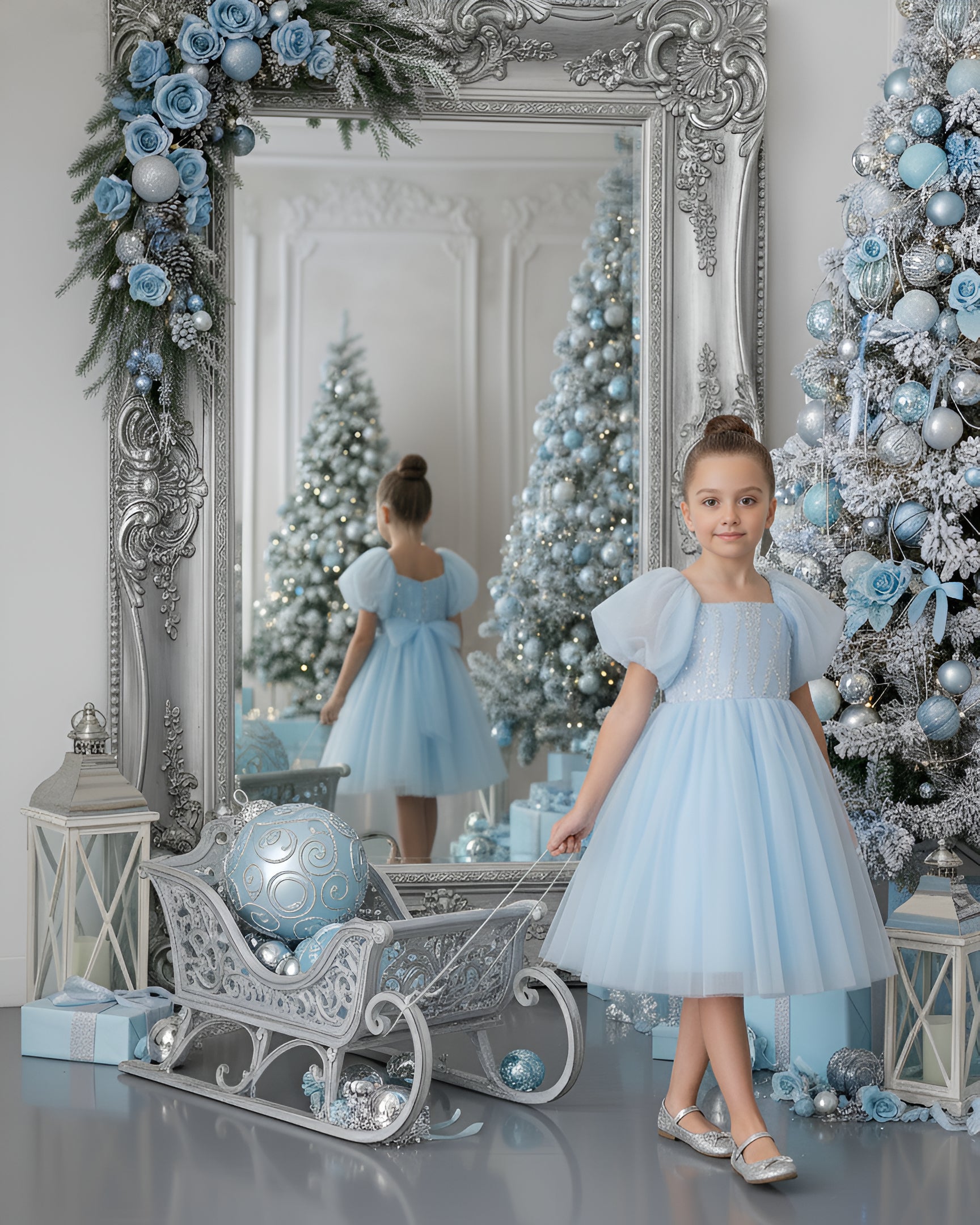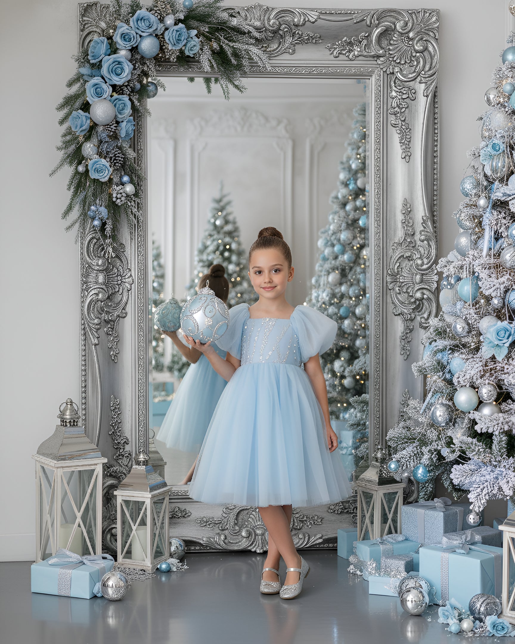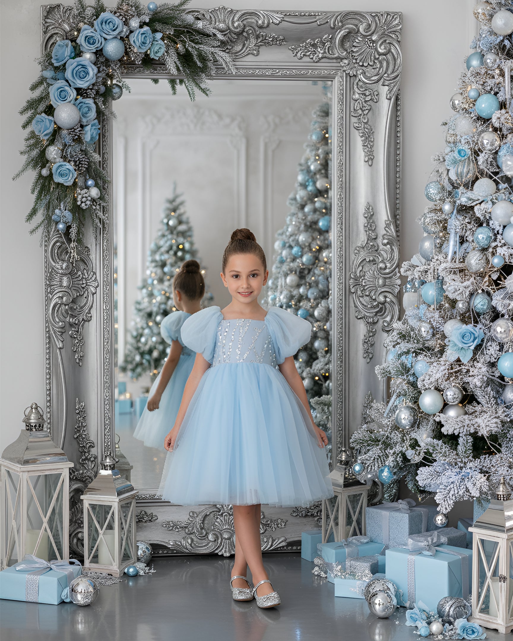 2Bunnies Girls Beaded Sequin Embellished Tulle Puff Sleeve Christmas Party Dress