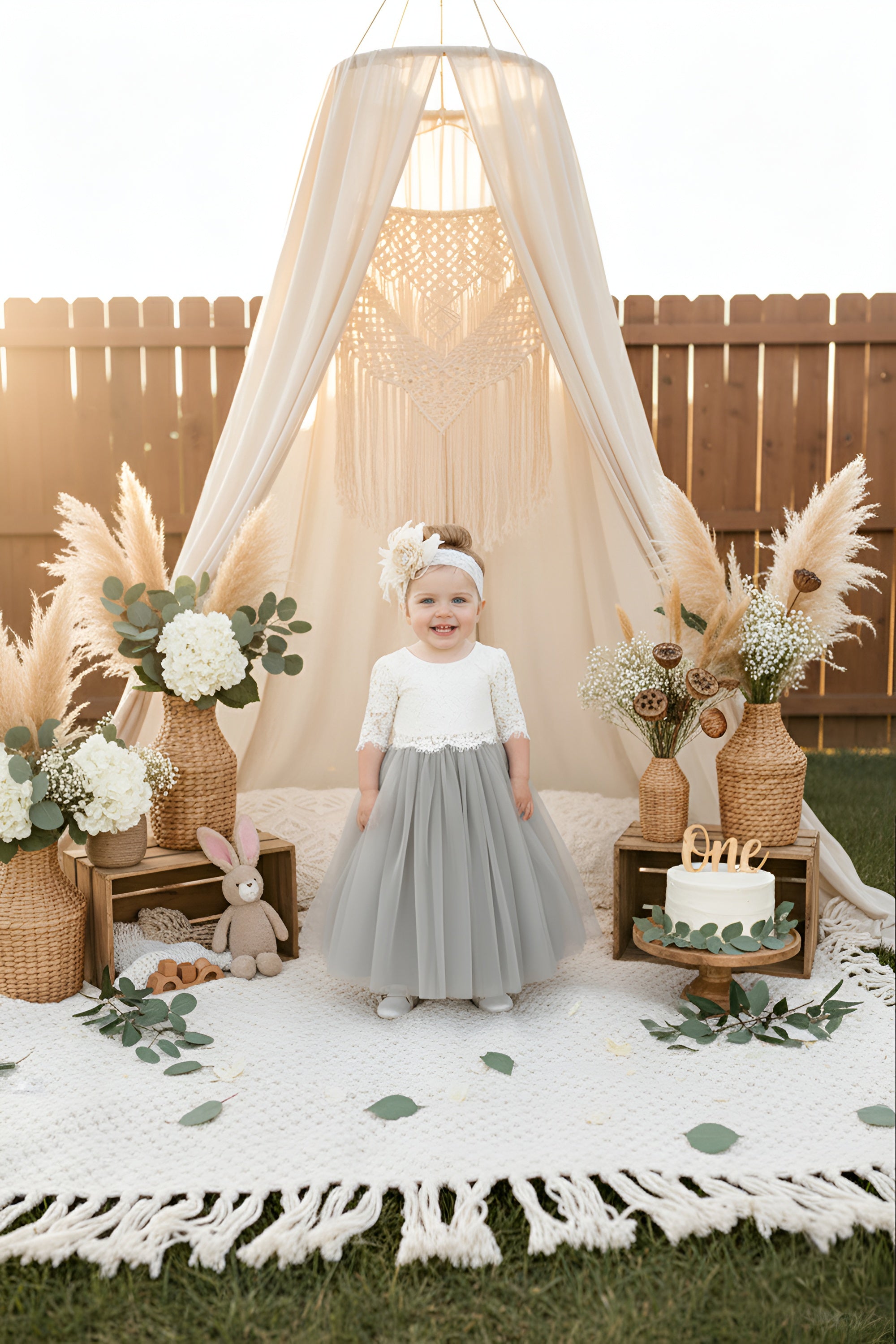 2Bunnies 2 Piece Lace Top Tulle Skirt Boho Rustic Baby Girl Dress Set