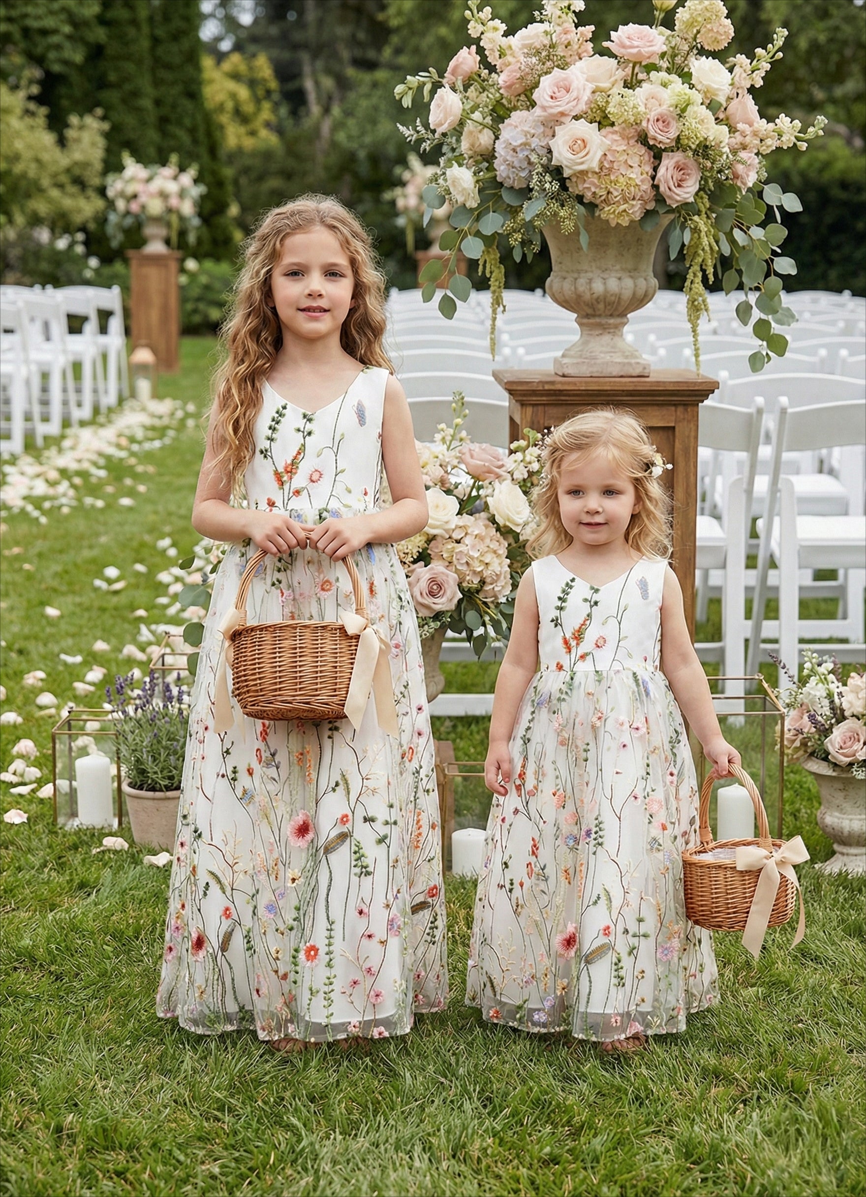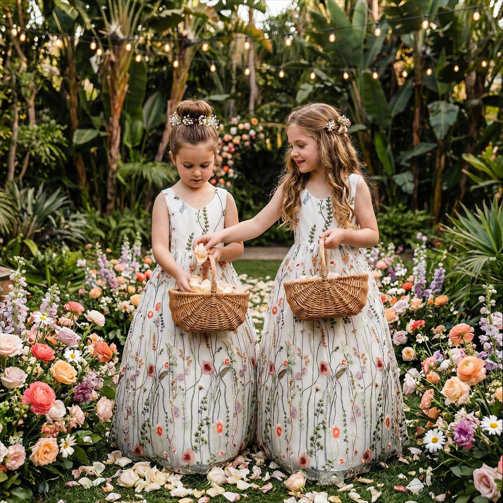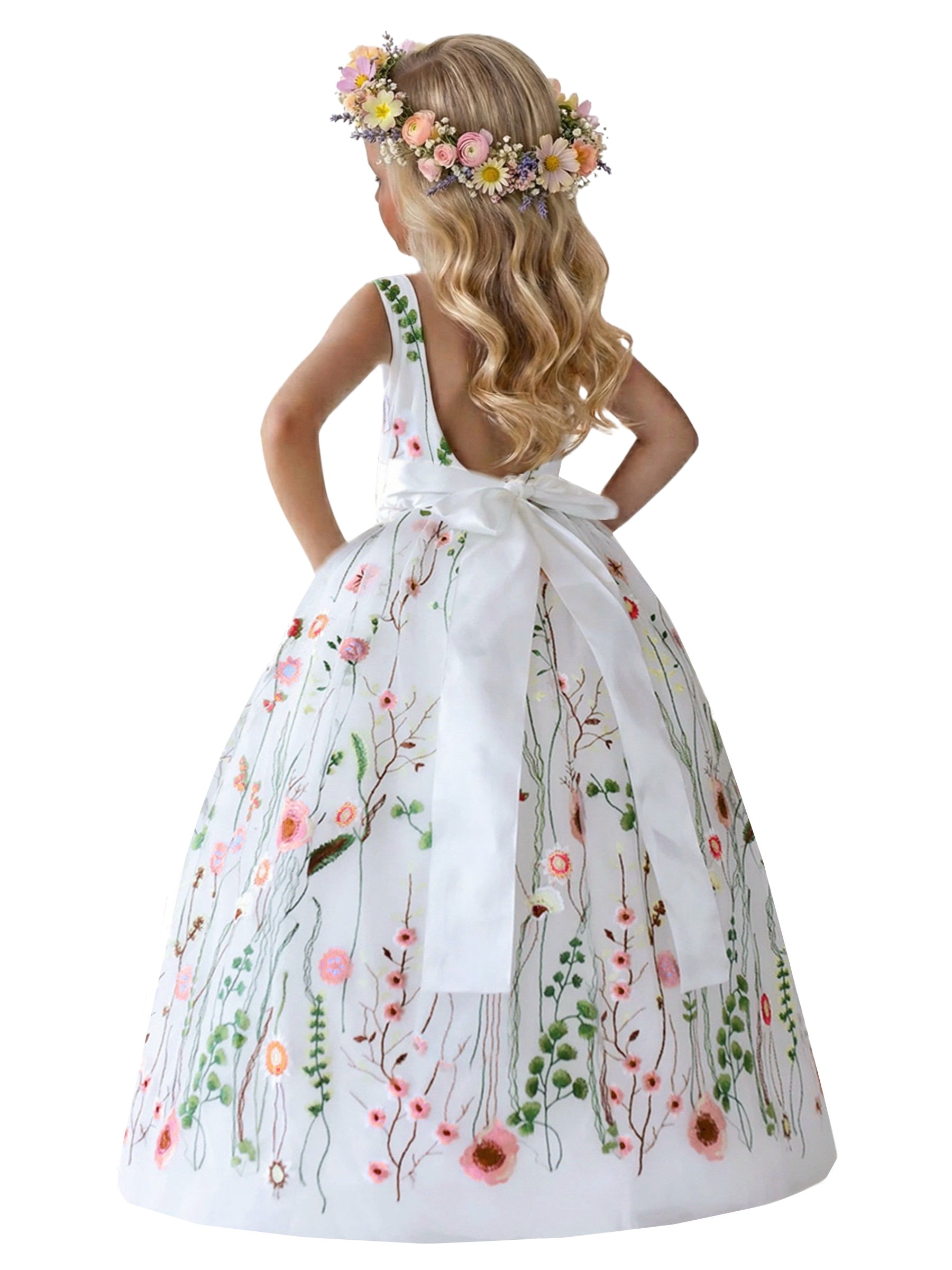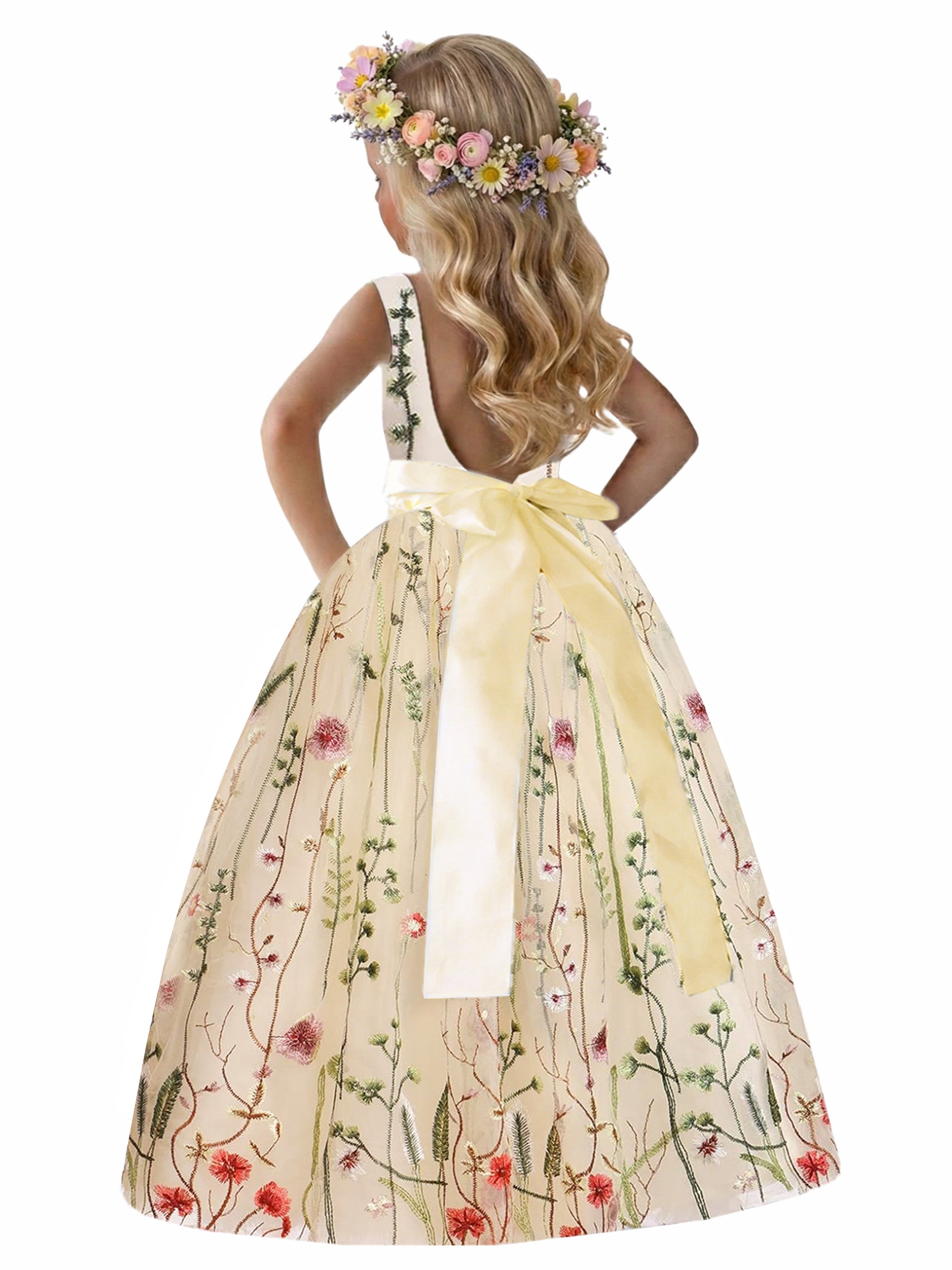 2Bunnies Girls' 12M-12yr Garden Wildflower Floral Embroidered Tulle Satin Girl Dress