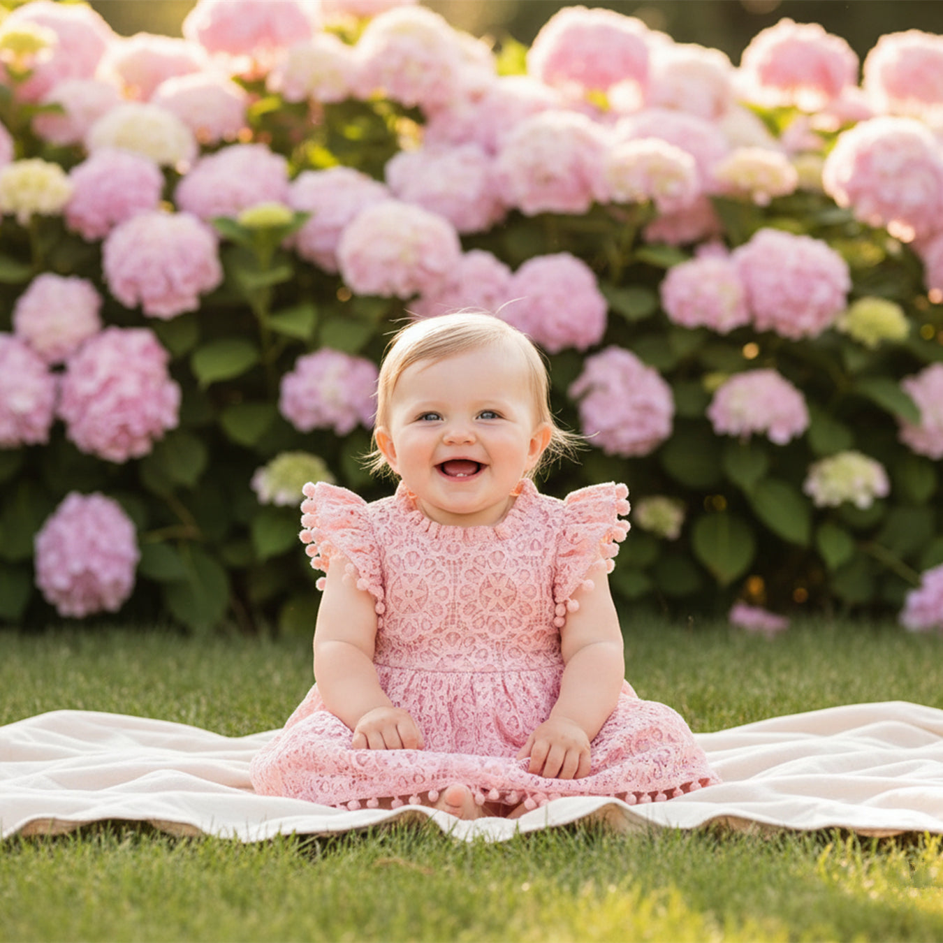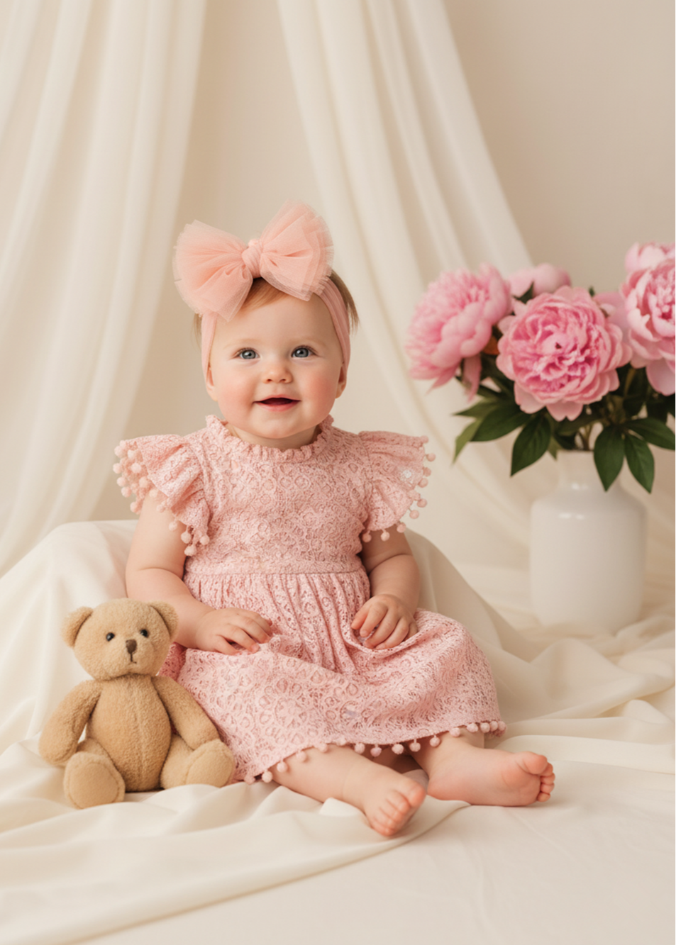 2Bunnies Lace Pom Pom Trim Baby Girl Dress