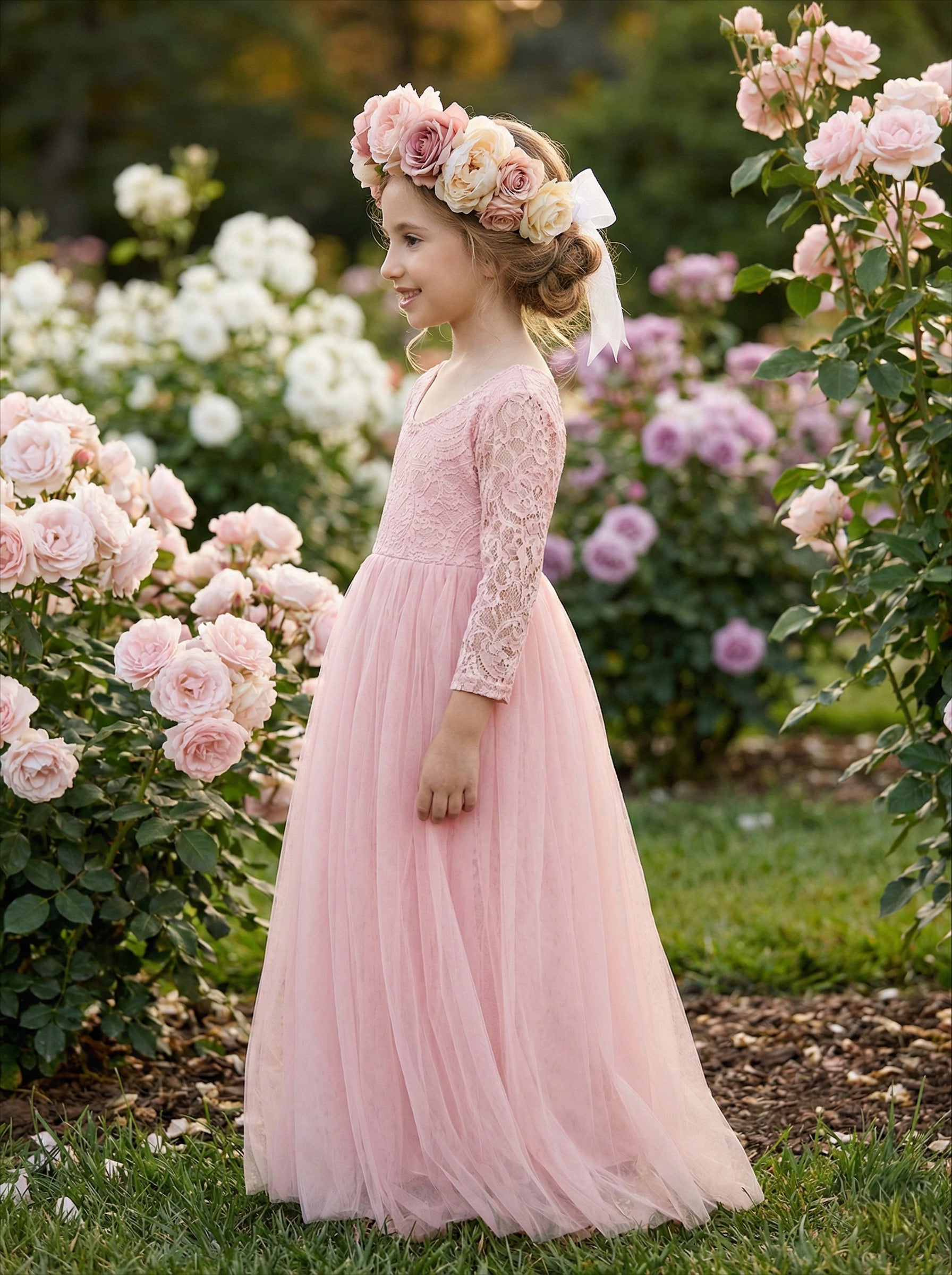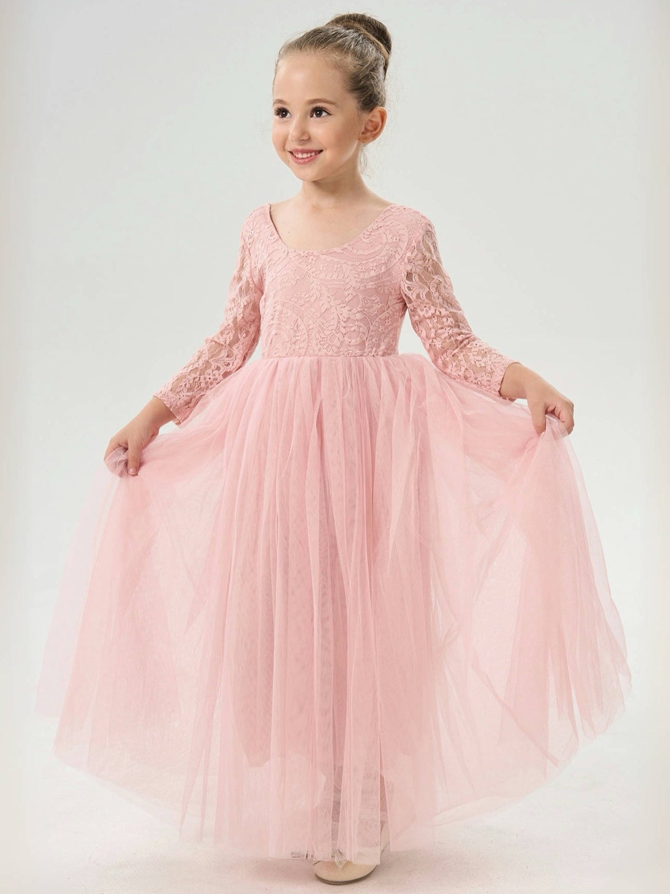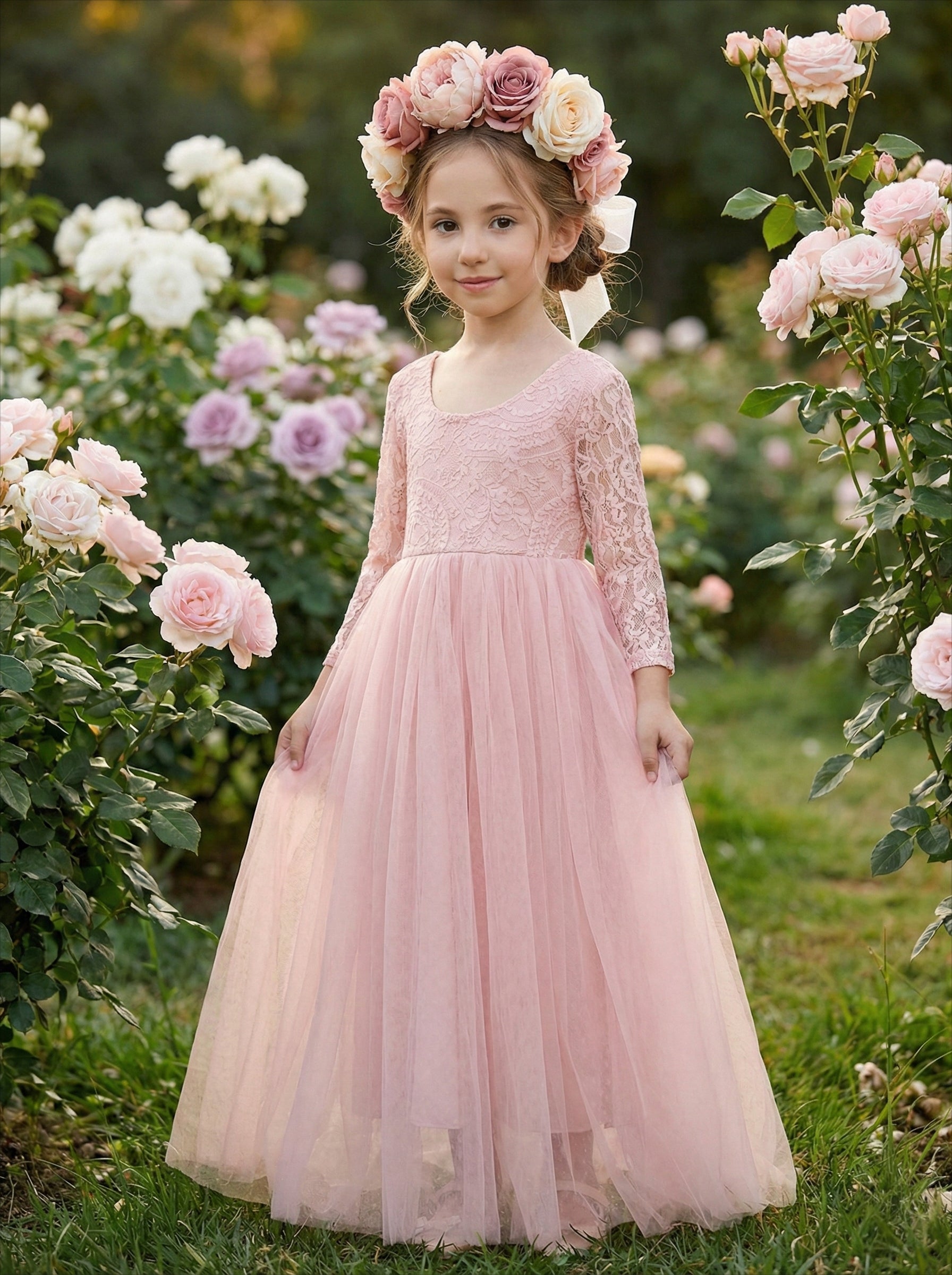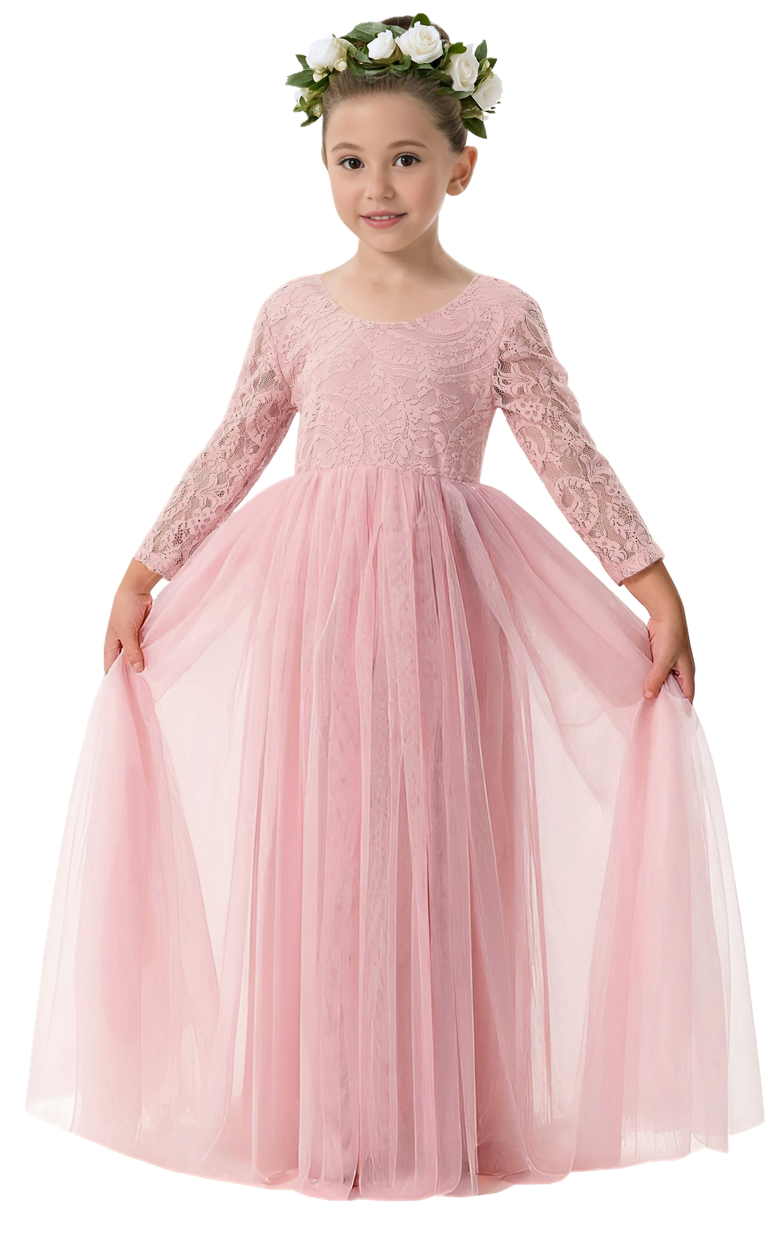 2Bunnies Girls' 12M-12yr Paisley Lace Tulle Long Sleeve Maxi Flower Girl Dress